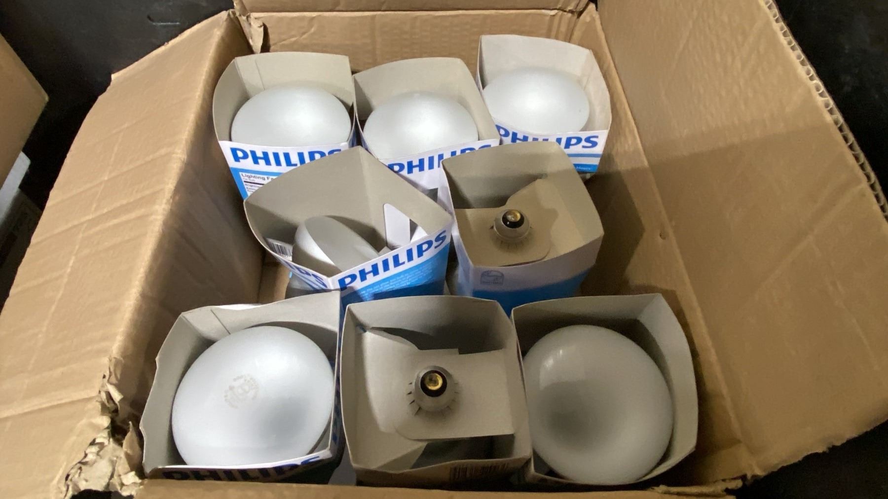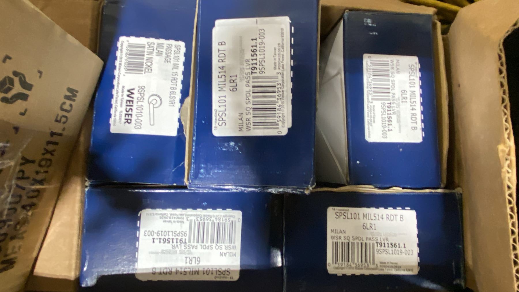 BIN OF ASSORTED HOME RENOVATION ITEMS INCLUDING WEISER DOOR HANDLES, WIRELESS WEATHER STATION,