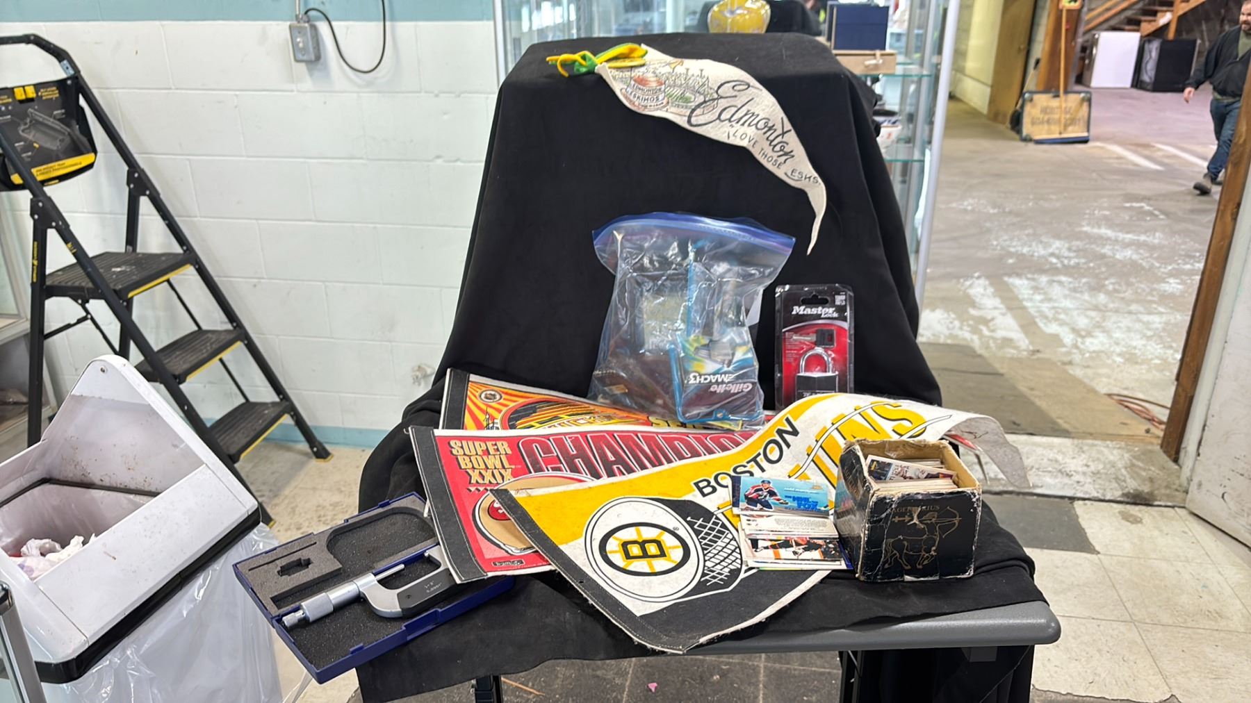 BIN OF ASSORTED ITEMS INCLUDING; GILLETTE MACH 3 REPLACEMENT BLADES, HOCKEY PENNANTS, POKEMON CARDS & MORE