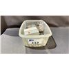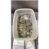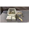 BIN OF ASSORTED ITEMS INCLUDING; JEWELRY, MAGNIFYING GLASS, MINI STEIN & MORE