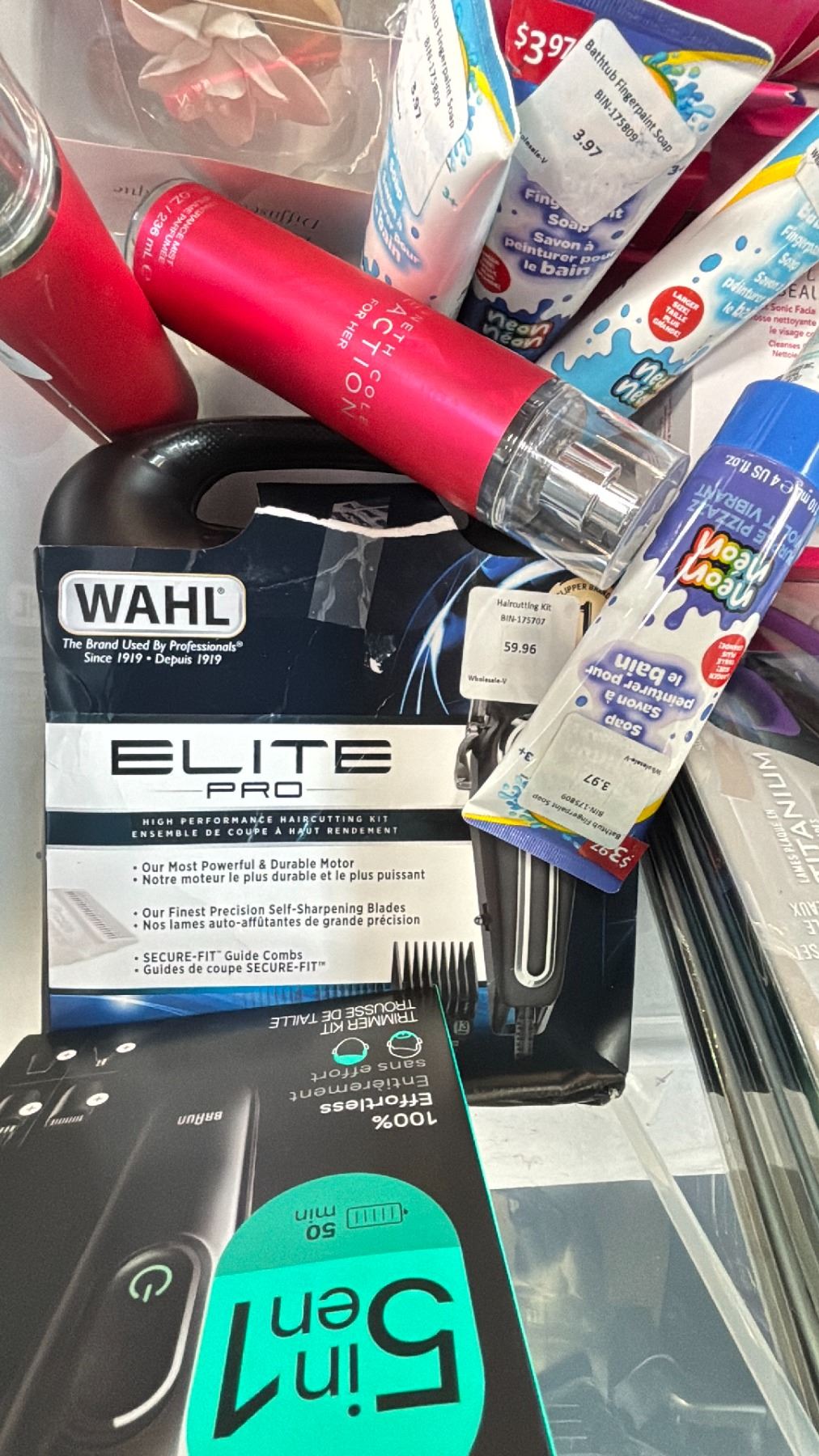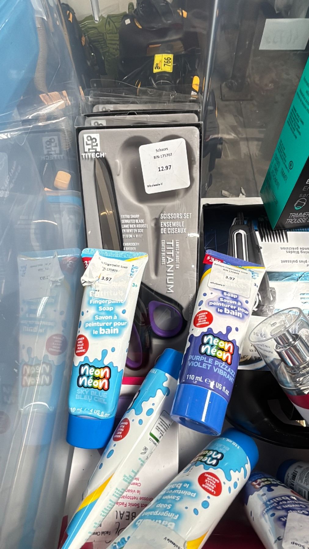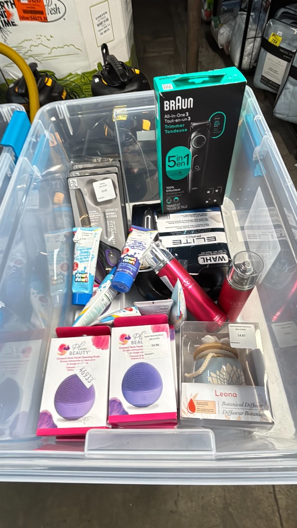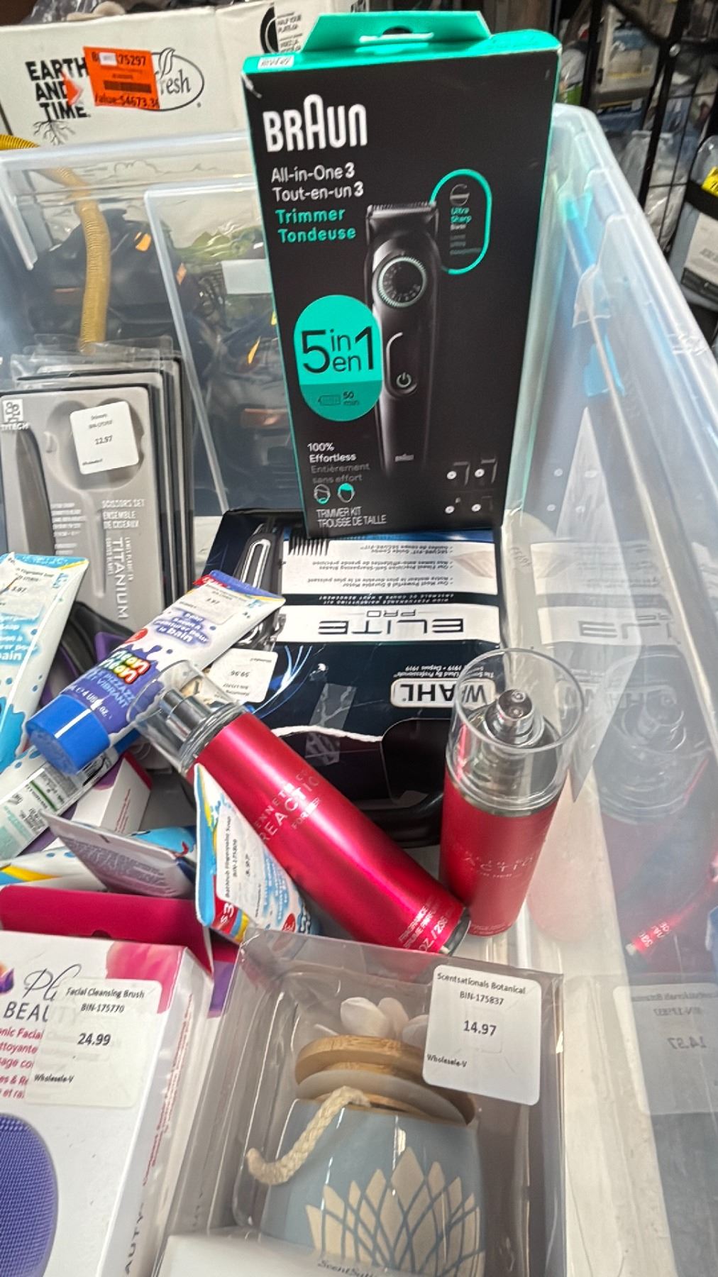 BIN OF ASSORTED ITEMS INCLUDING; SCISSORS, BRAUN TRIMMER, WAHL HAIR CUTTING KIT & MORE