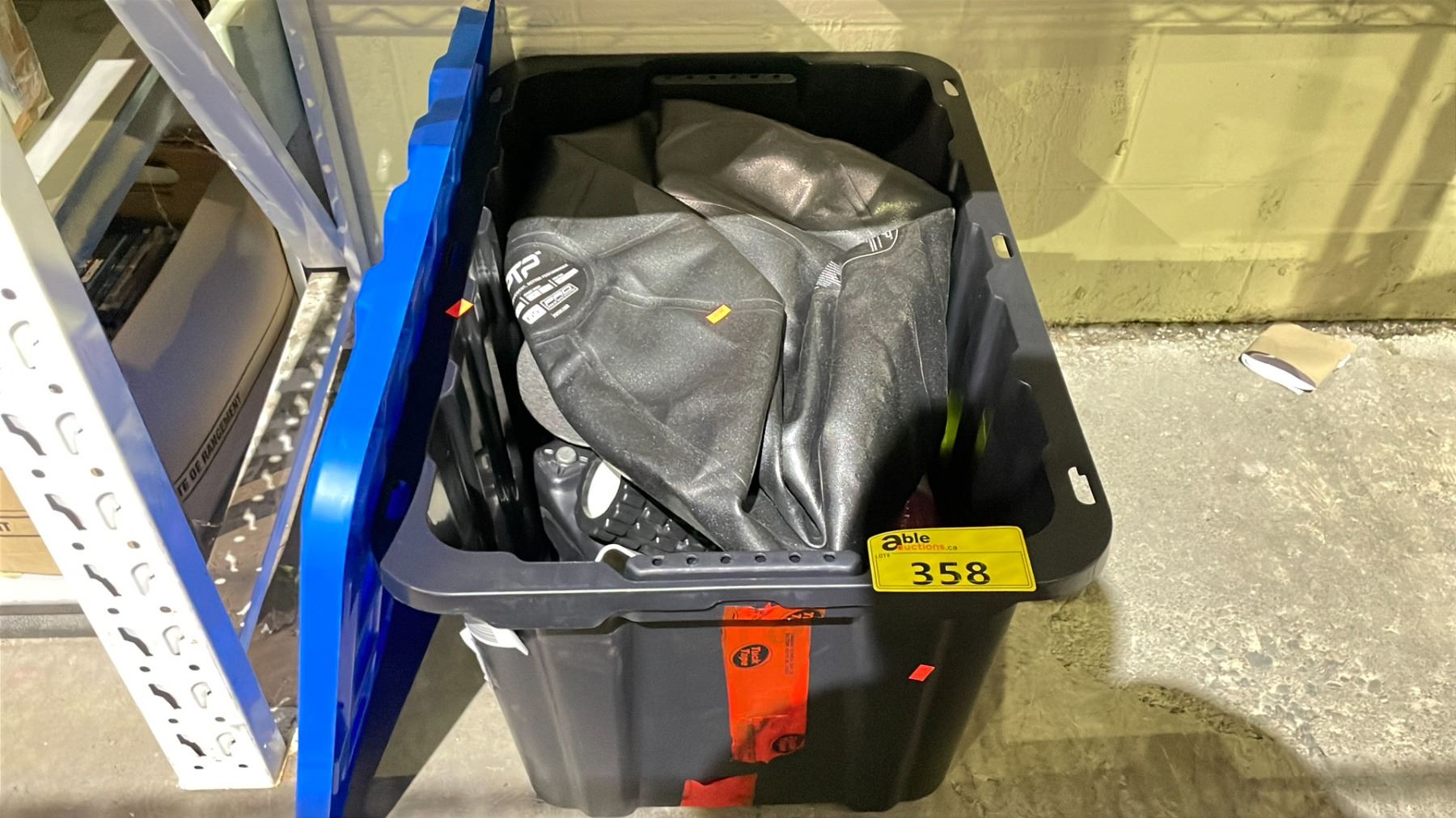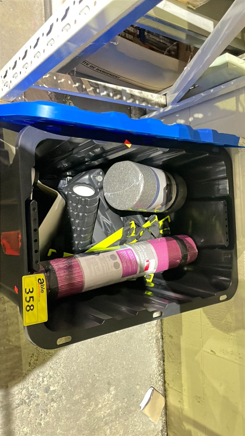BIN OF ASSORTED ITEMS INCLUDING; YOGA MAT, EXERCISE BALL, LEG ROLLER & MORE