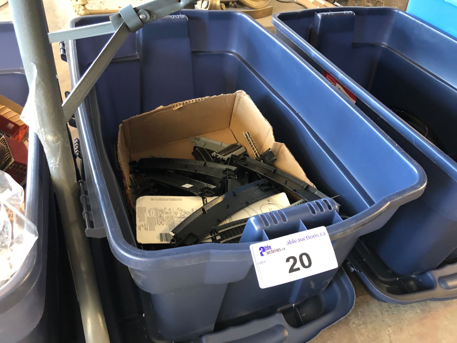 BIN OF ASSORTED MODEL TRAIN PARTS/TRACK/BUILDINGS