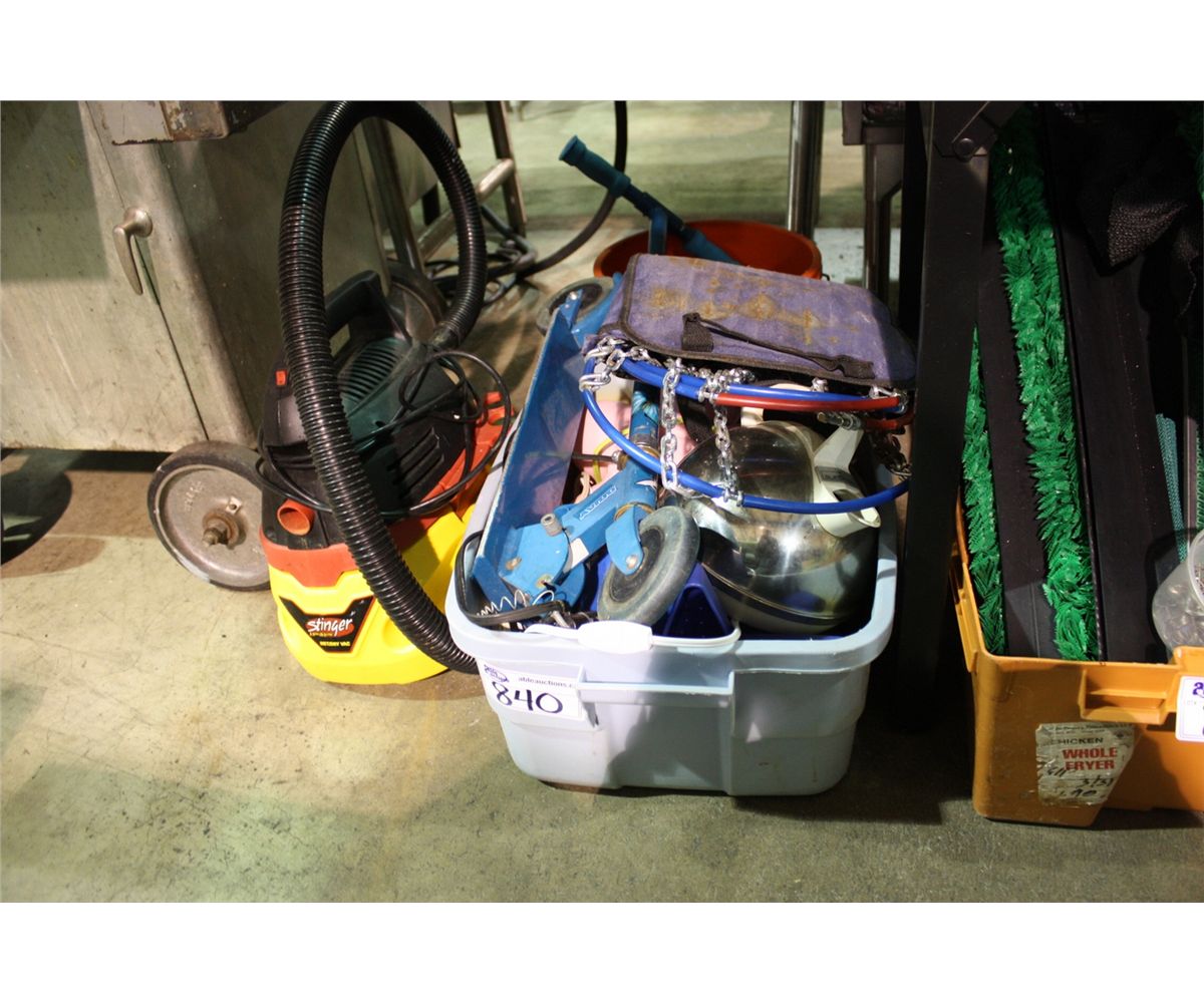 BIN OF ASSORTED OFFICE PRODUCTS AND VACUUM