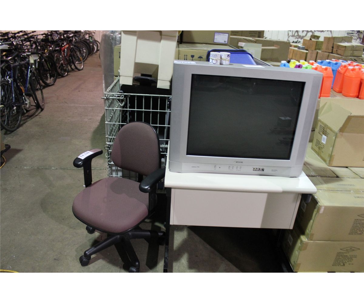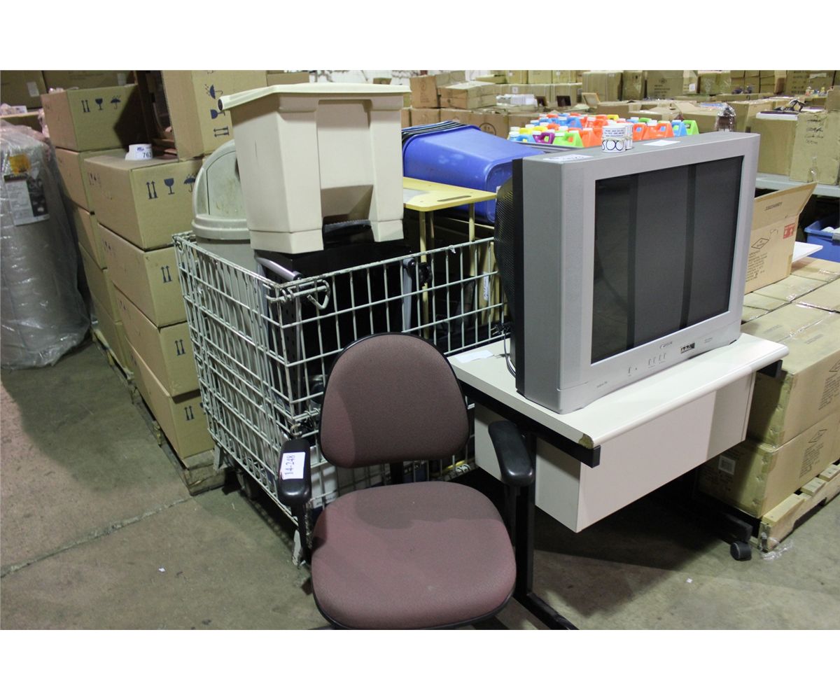 BIN OF ASSORTED OFFICE SUPPLIES, TV, MOBILE DESK AND OFFICE CHAIR ( BIN NOT INCLUDED )
