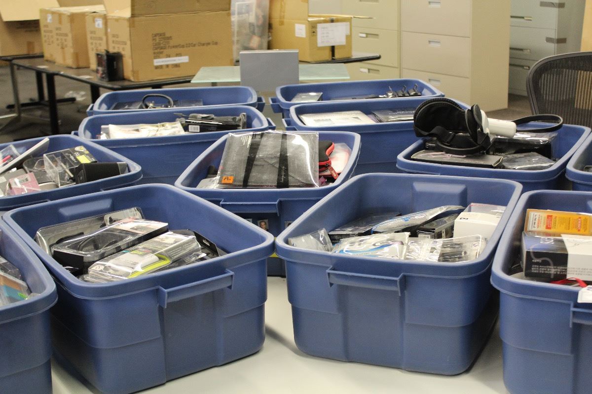 BIN OF ASSORTED PHONE CASES, SCREEN PROTECTORS, AND MISC. DEVICE ACCESSORIES (BIN NOT INCLUDED)