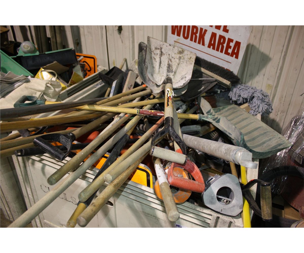 BIN OF ASSORTED SHOVELS, BROOMS ETC *BIN NO GO*
