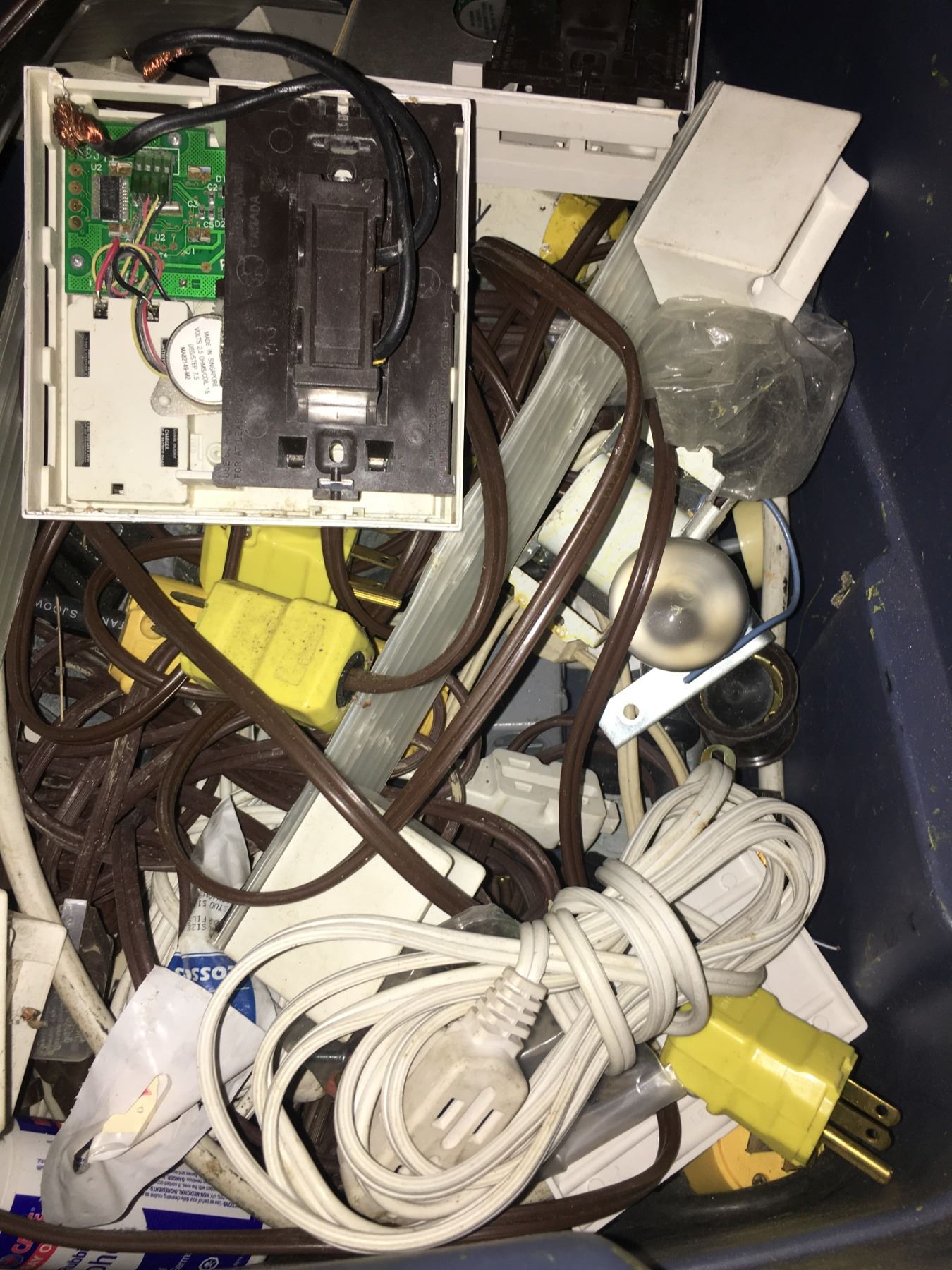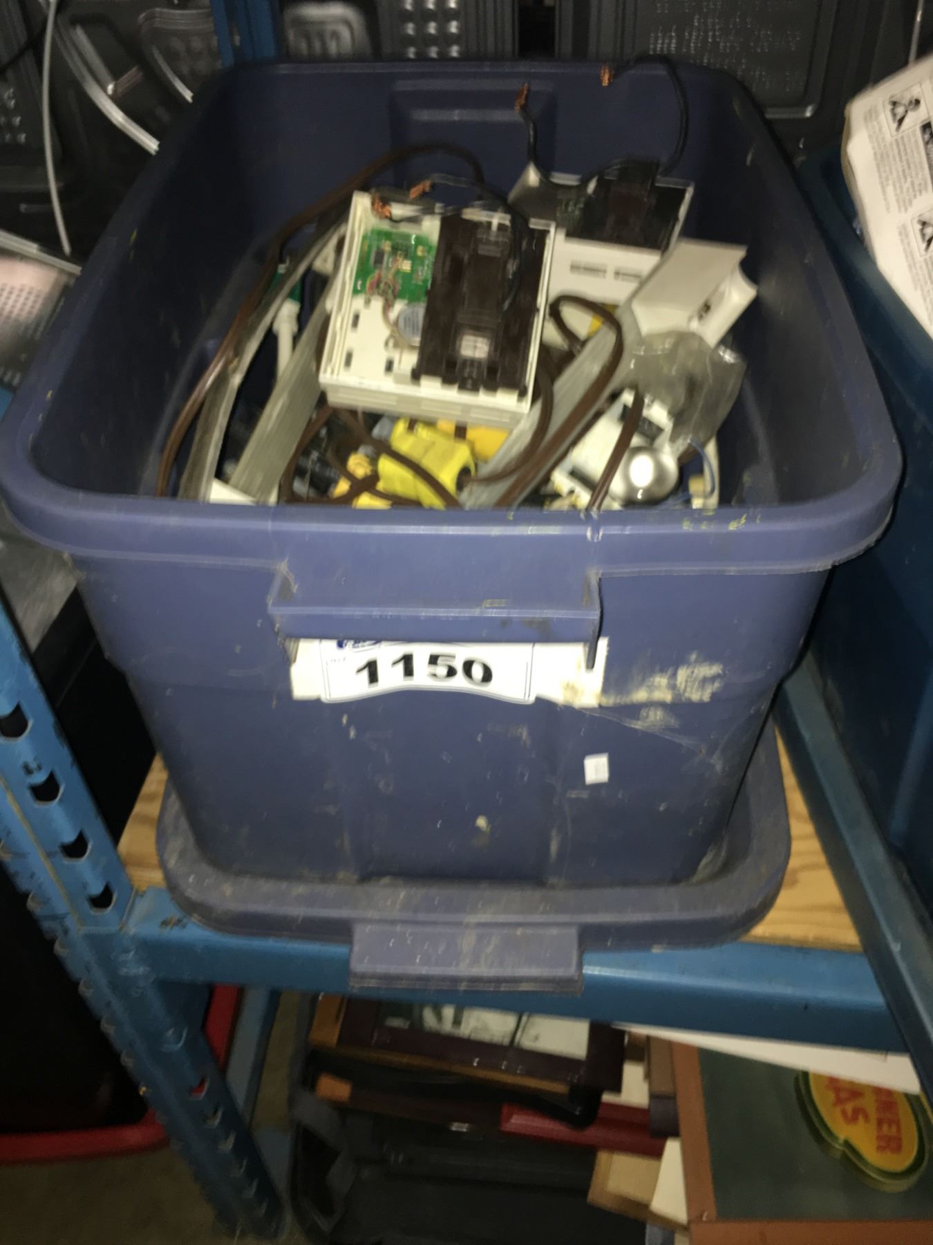 BIN OF ASSORTED THERMOSTATS & ELECTRICAL