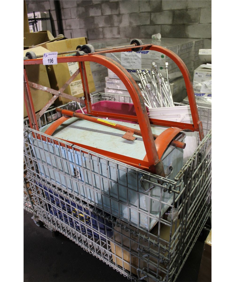 BIN OF ASSORTED TOOLS AND BARREL CART (BIN NO GO)