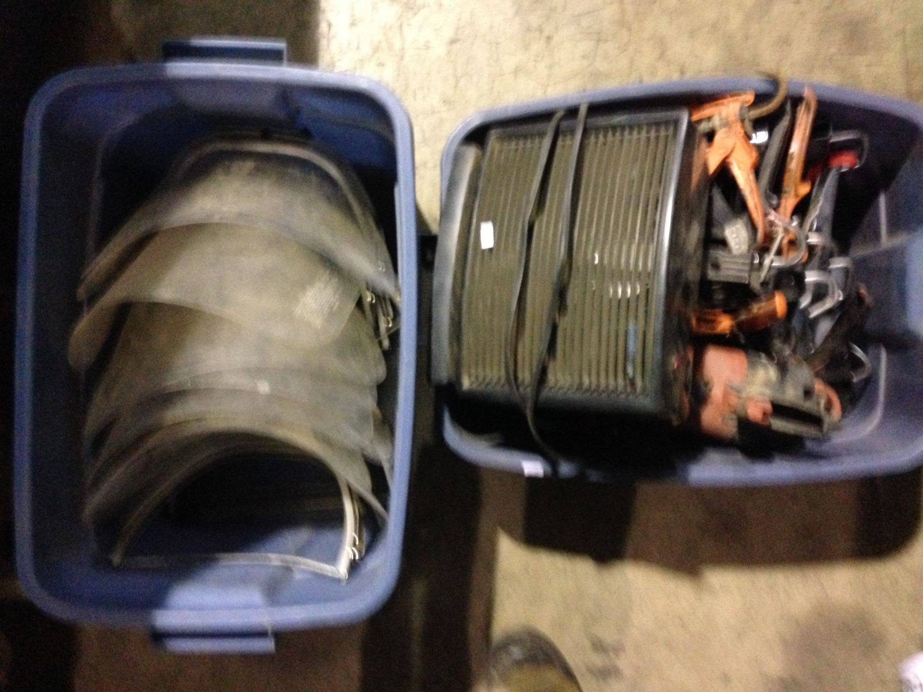 BIN OF ASSORTED TOOLS & BIN OF FACE SHIELDS