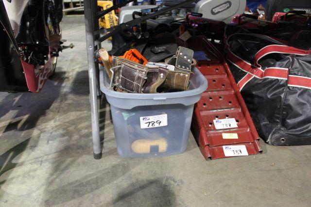 BIN OF ASSORTED TOOLS & CAR RAMPS