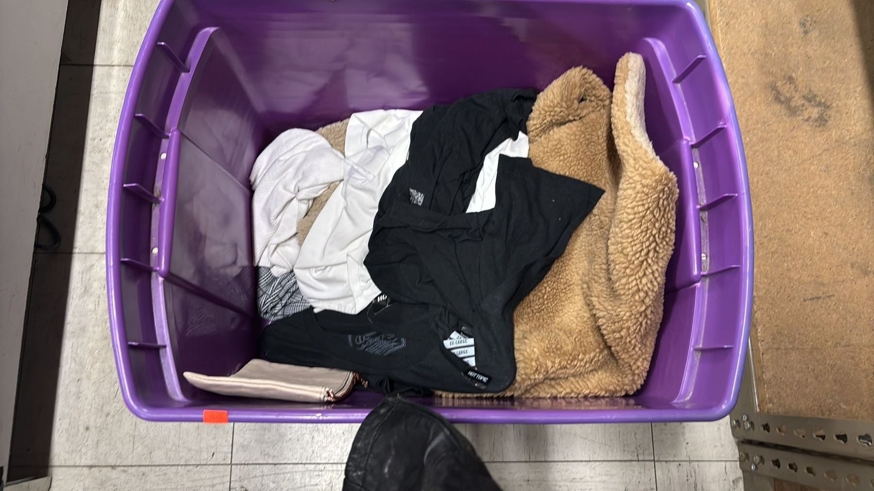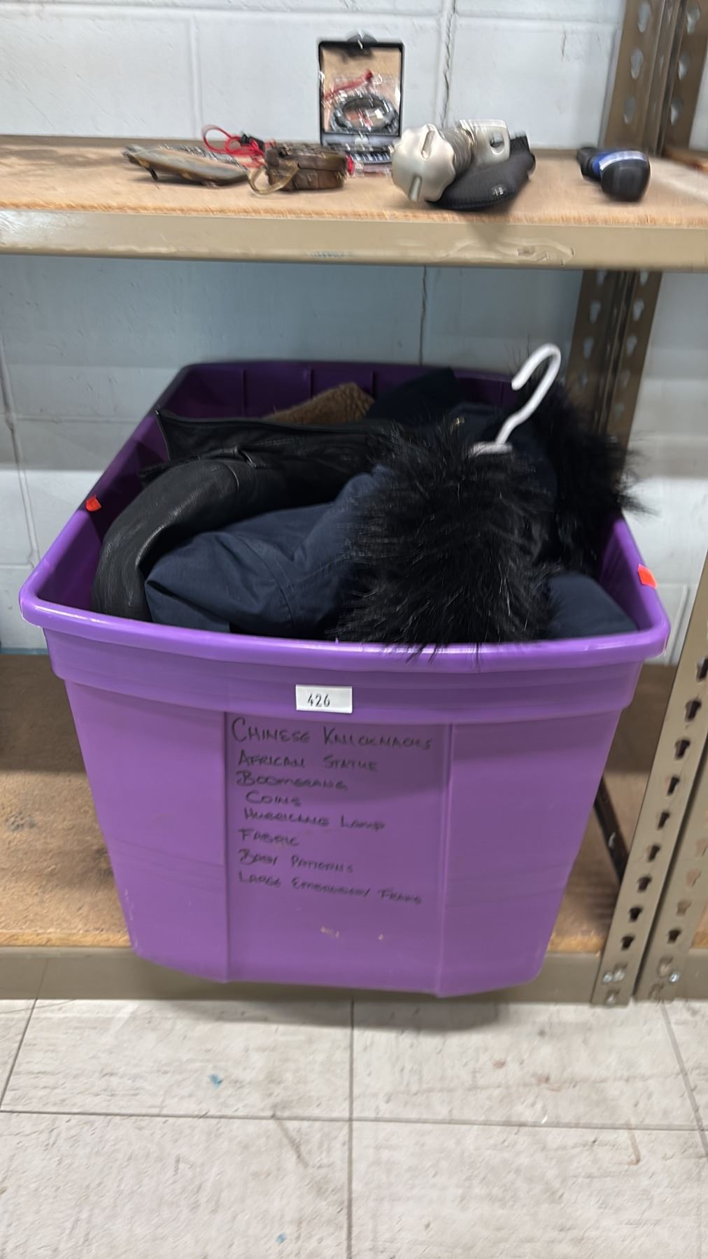 BIN OF ASSORTED WOMENS CLOTHING COATS, SHIRTS & MORE