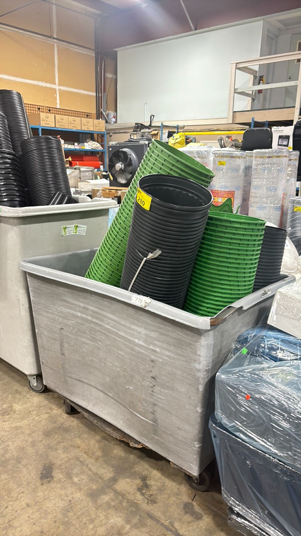 BIN OF BLACK GARDENSTAR 15L PLASTIC PLANTER POTS & GREEN PLASTIC PLANTER POTS WITH TRAYS *BIN NOT INCLUDED*