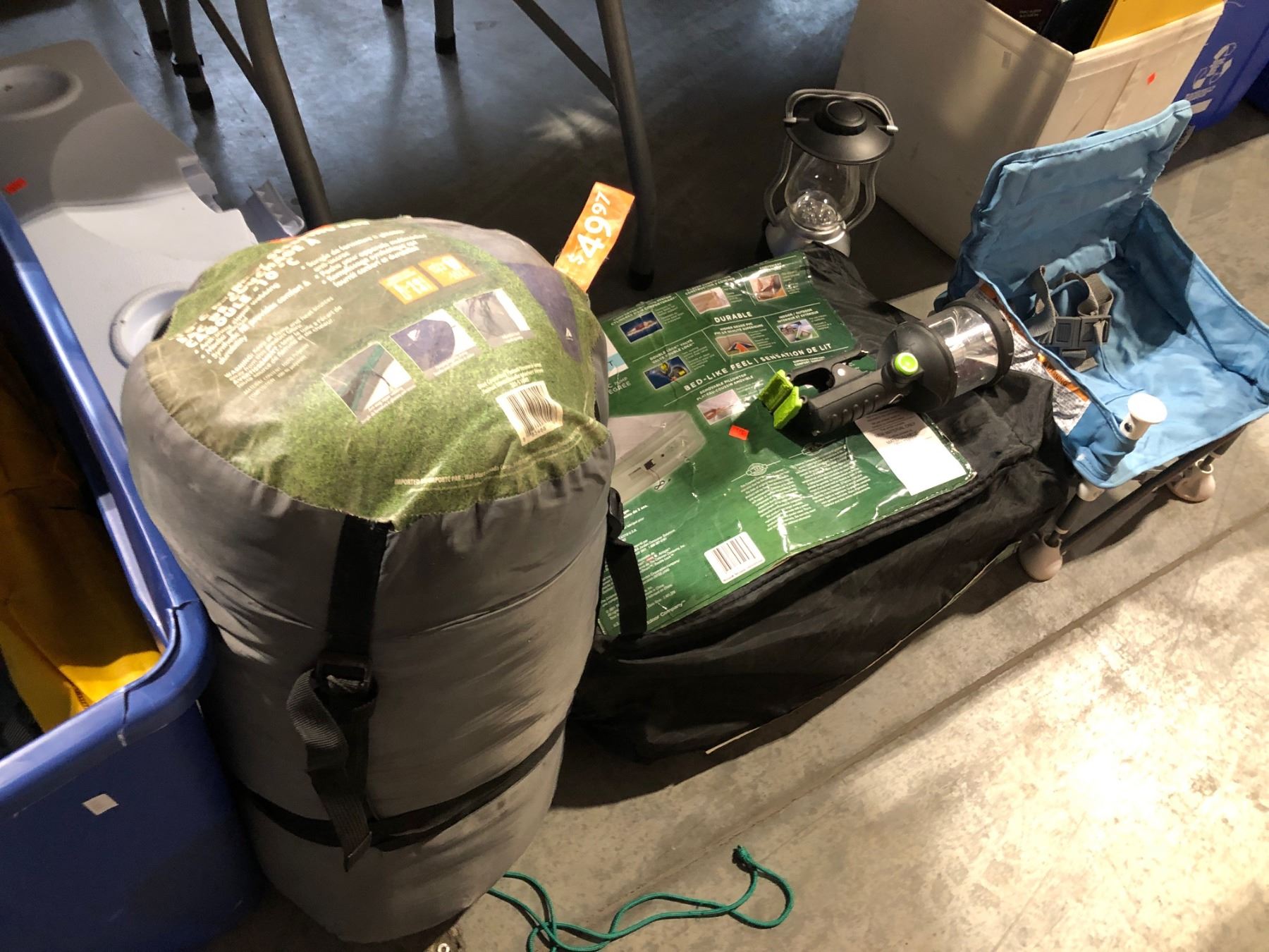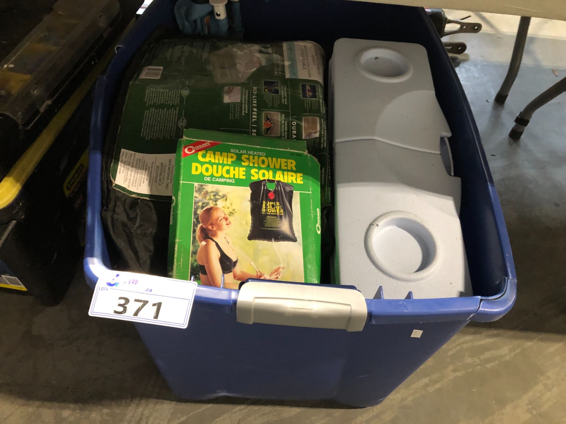 BIN OF CAMPING SUPPLIES INCLUDING A MINUS 10 MUMMY BAG, LANTERN, AIR MATTRESS, CAMPING CHAIR,