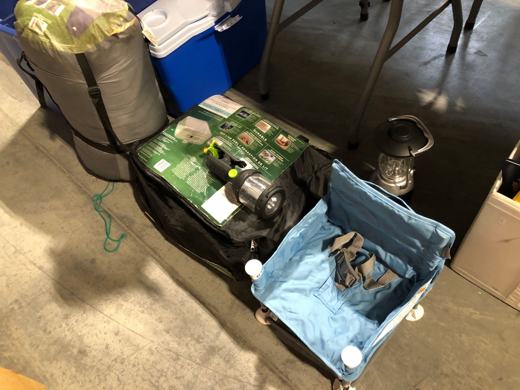 BIN OF CAMPING SUPPLIES INCLUDING A MINUS 10 MUMMY BAG, LANTERN, AIR MATTRESS, CAMPING CHAIR, COOLER AND MORE