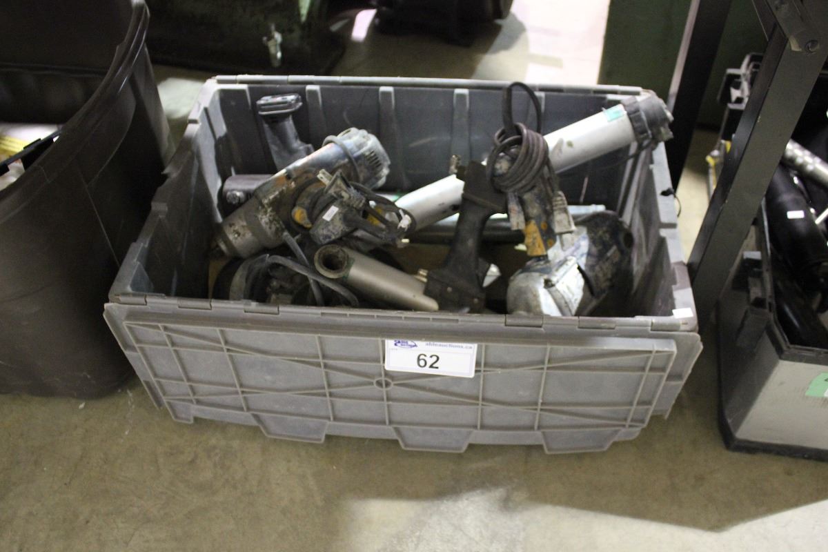 BIN OF CAULKING GUNS AND ASSORTED TOOLS