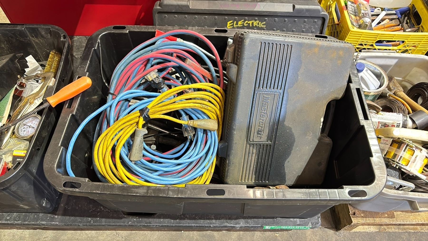 BIN OF EXTENSION CORDS, GREASE GUNS, RIDGID PIPE WRENCHES, SOCKETS & MORE *BIN INCLUDED*