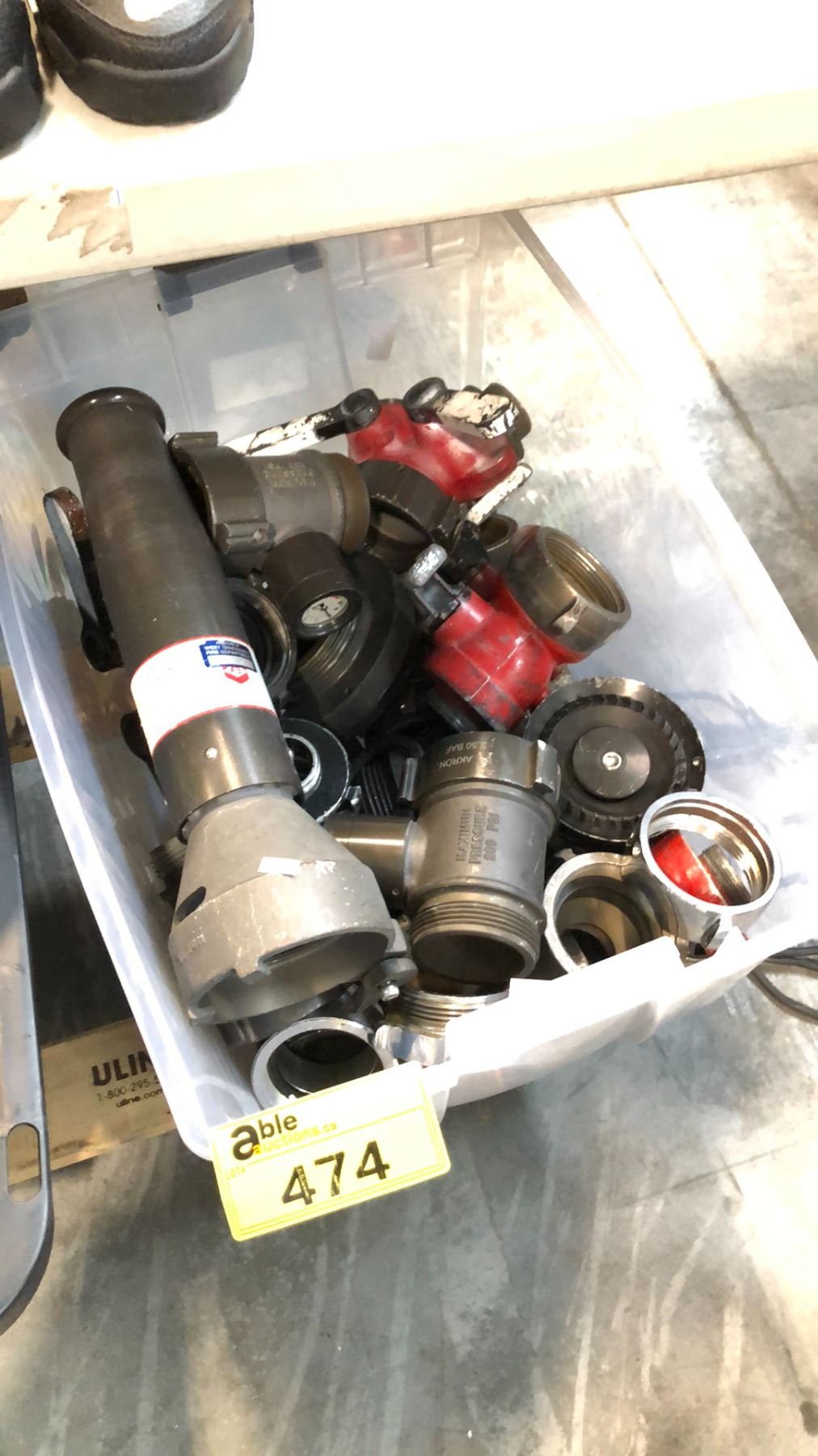 BIN OF FIREFIGHTER HOSE, NOZZLE, PIPE COUPLER AND MORE - BIN NOT INCLUDED