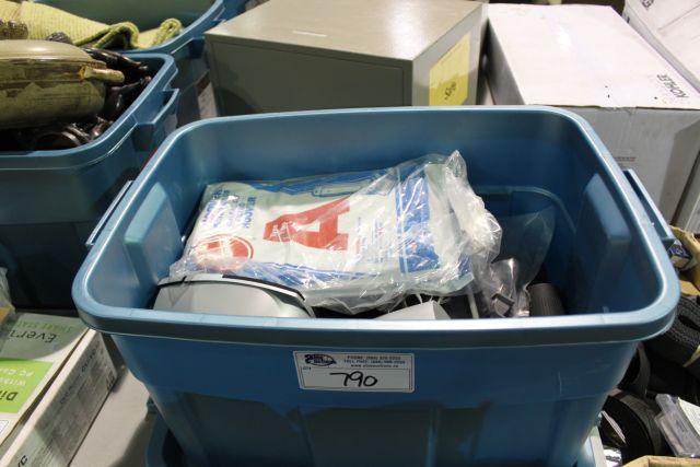 BIN OF MISC CLEANING PRODUCT & WALKIE TALKIE