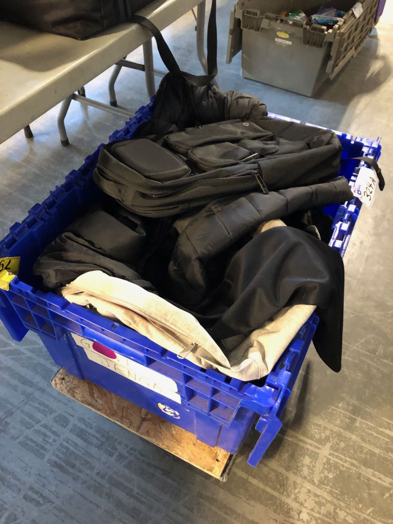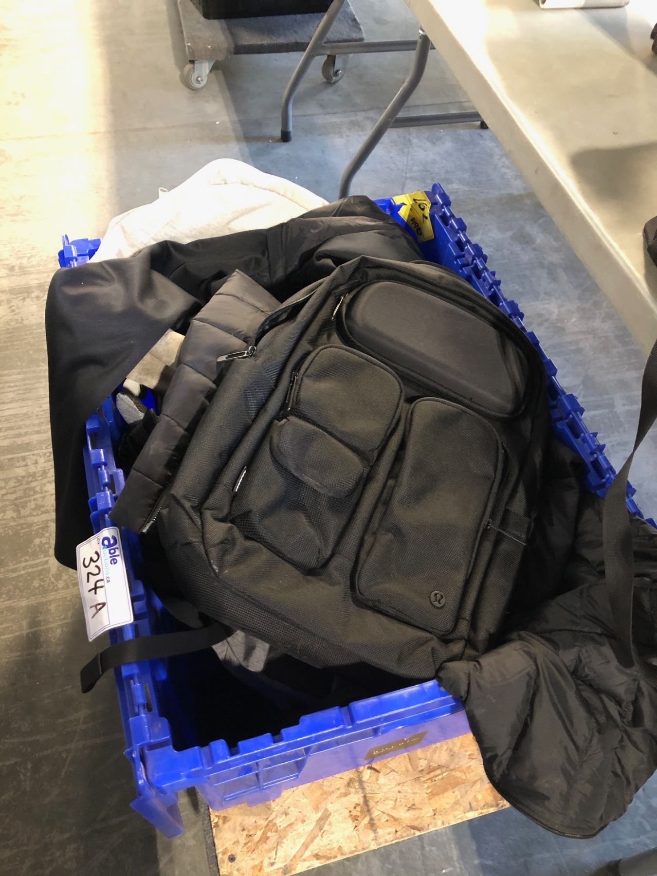 BIN OF MIXED CLOTHING INCLUDING LULULEMON & HERSCHEL BAGS, CALVIN KLEIN CLOTHING & MORE - BIN NOT INCLUDED