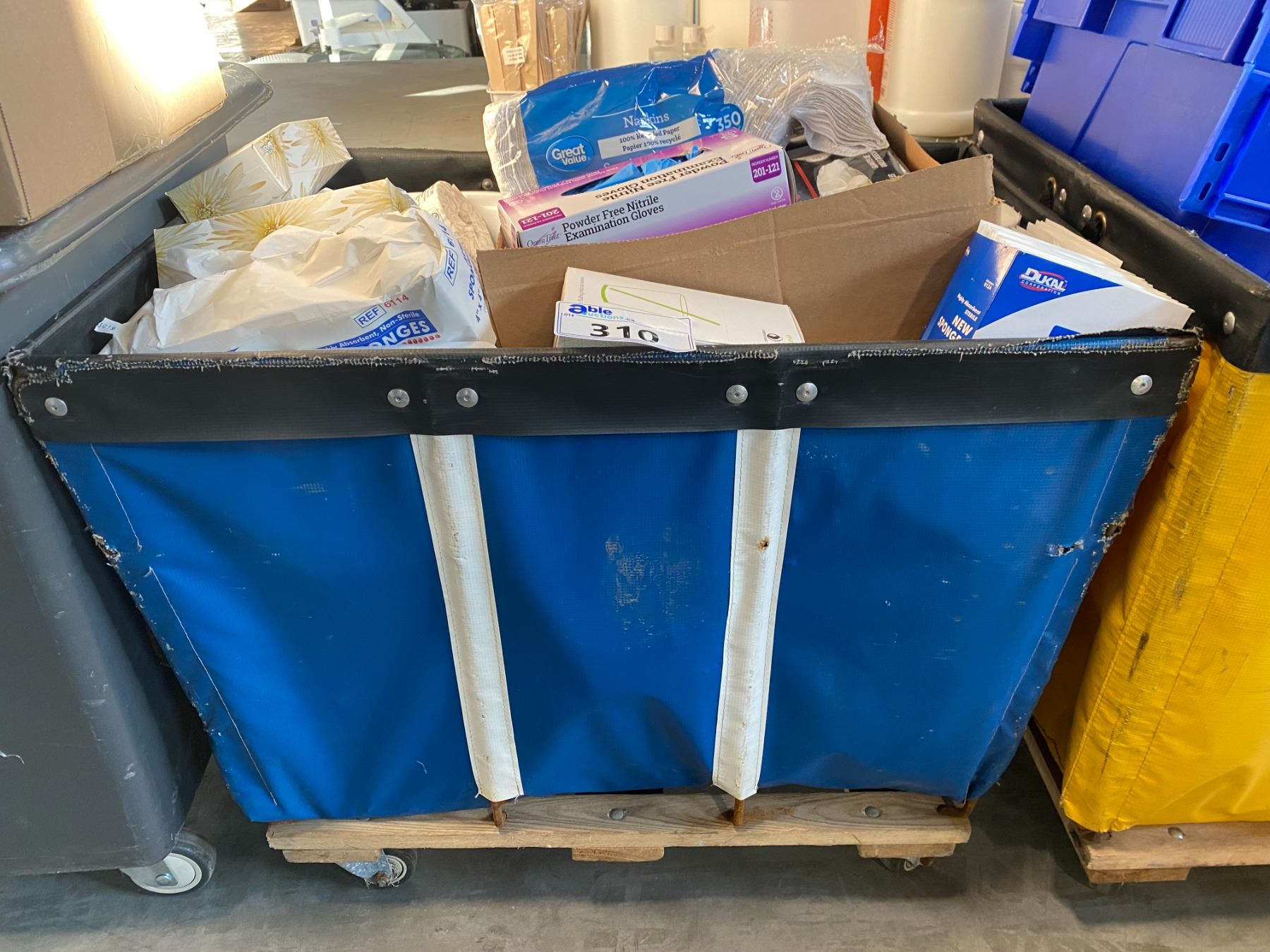 BIN OF SPA SUPPLIES, MASKS, BATHROOM TISSUE, GLOVES, PAPER DRAPES AND MORE - BIN NOT INCLUDED