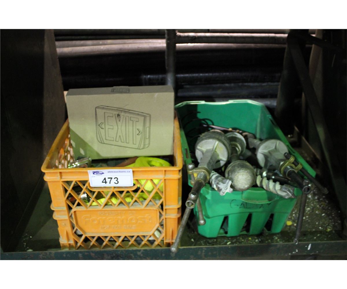 BIN OF STRAPS AND PLUMBING PIPE STOPS/DRILL BITS