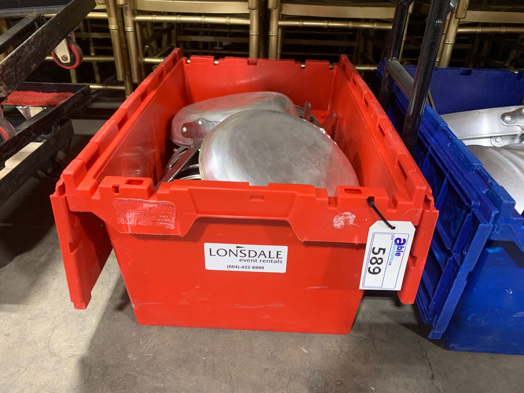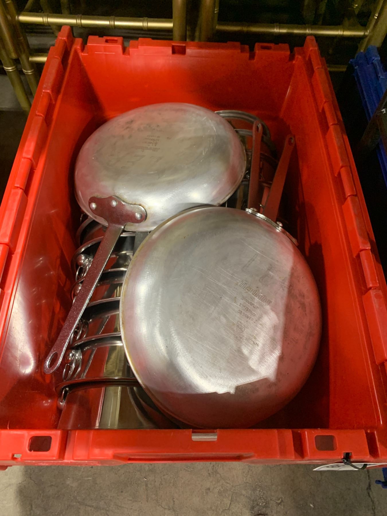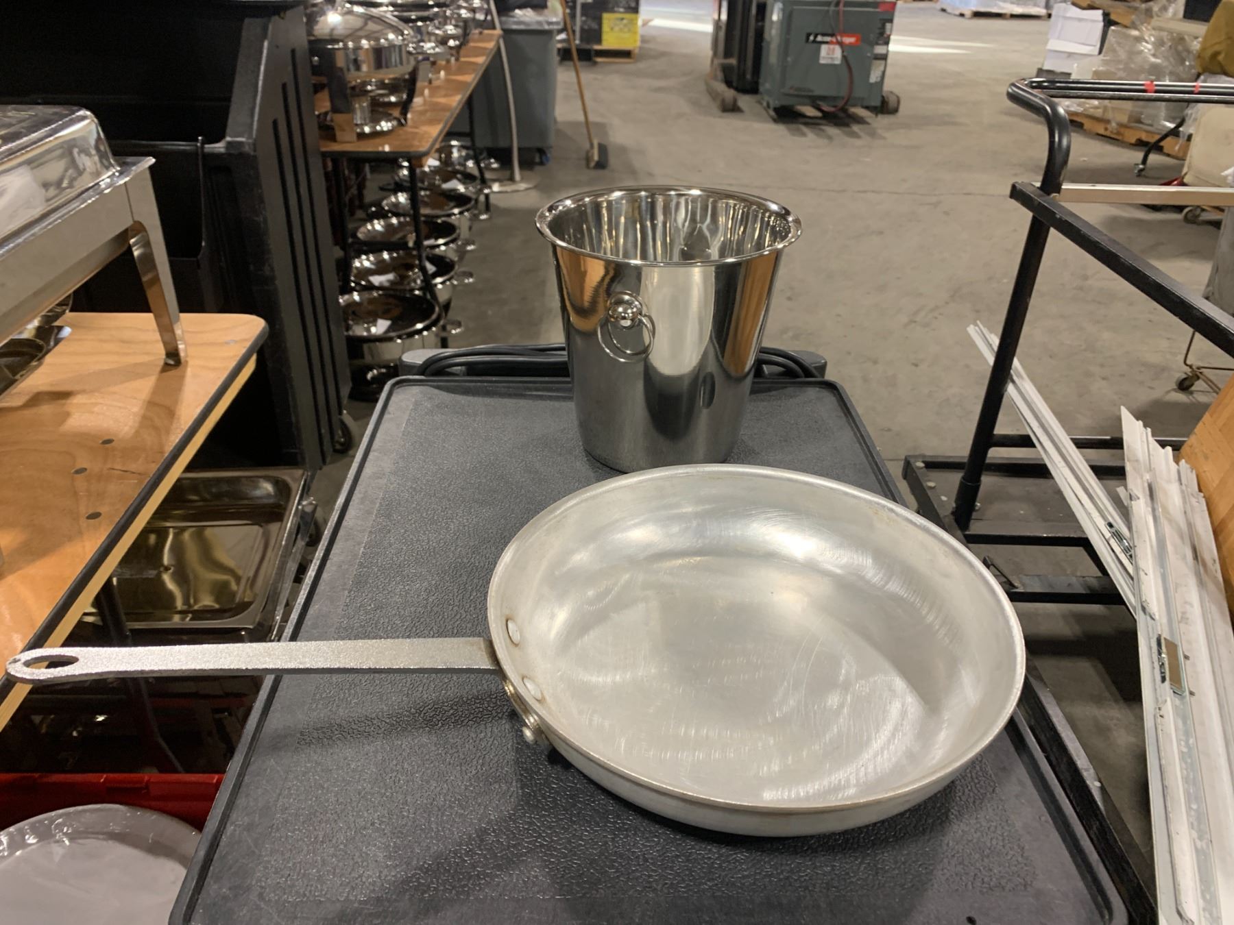 BIN OF THERMALLOY COMMERCIAL FRYING PANS & STACKS OF CHROME COMMERCIAL DESIGNER ICE BUCKETS *BIN INCLUDED*