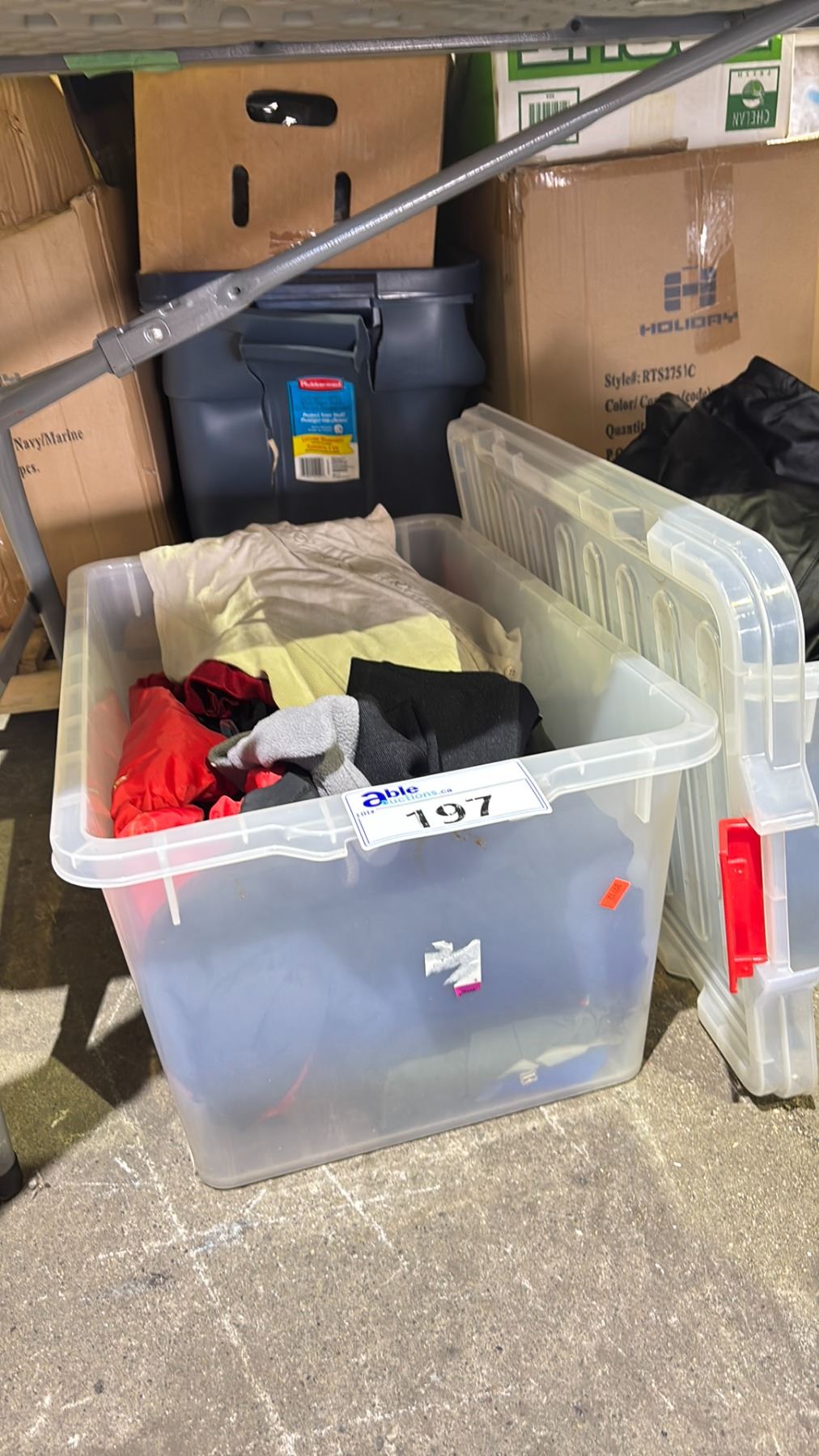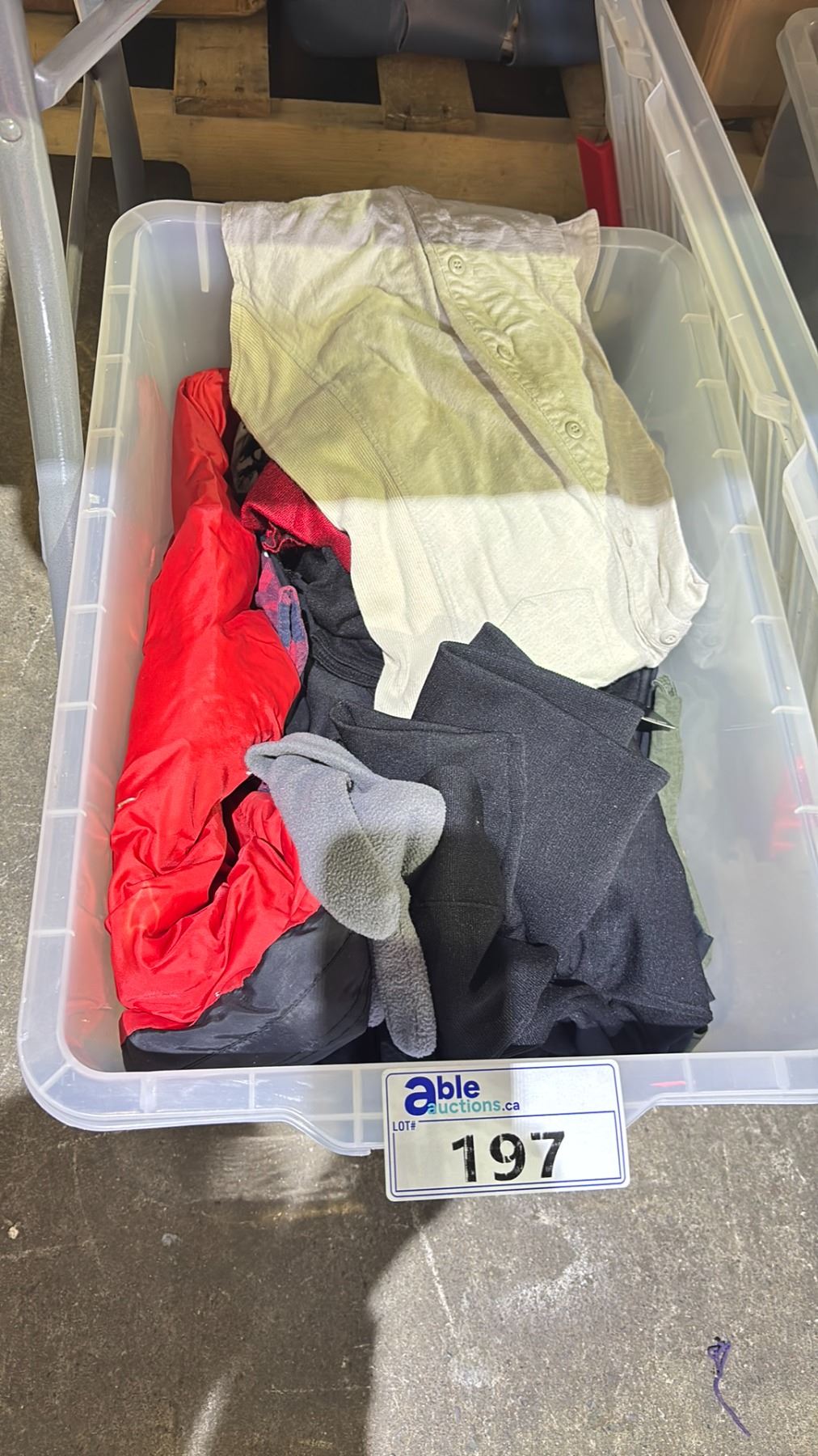 BIN OF VARIOUS STYLES & SIZES OF WOMENS CLOTHES, MOST L-XL