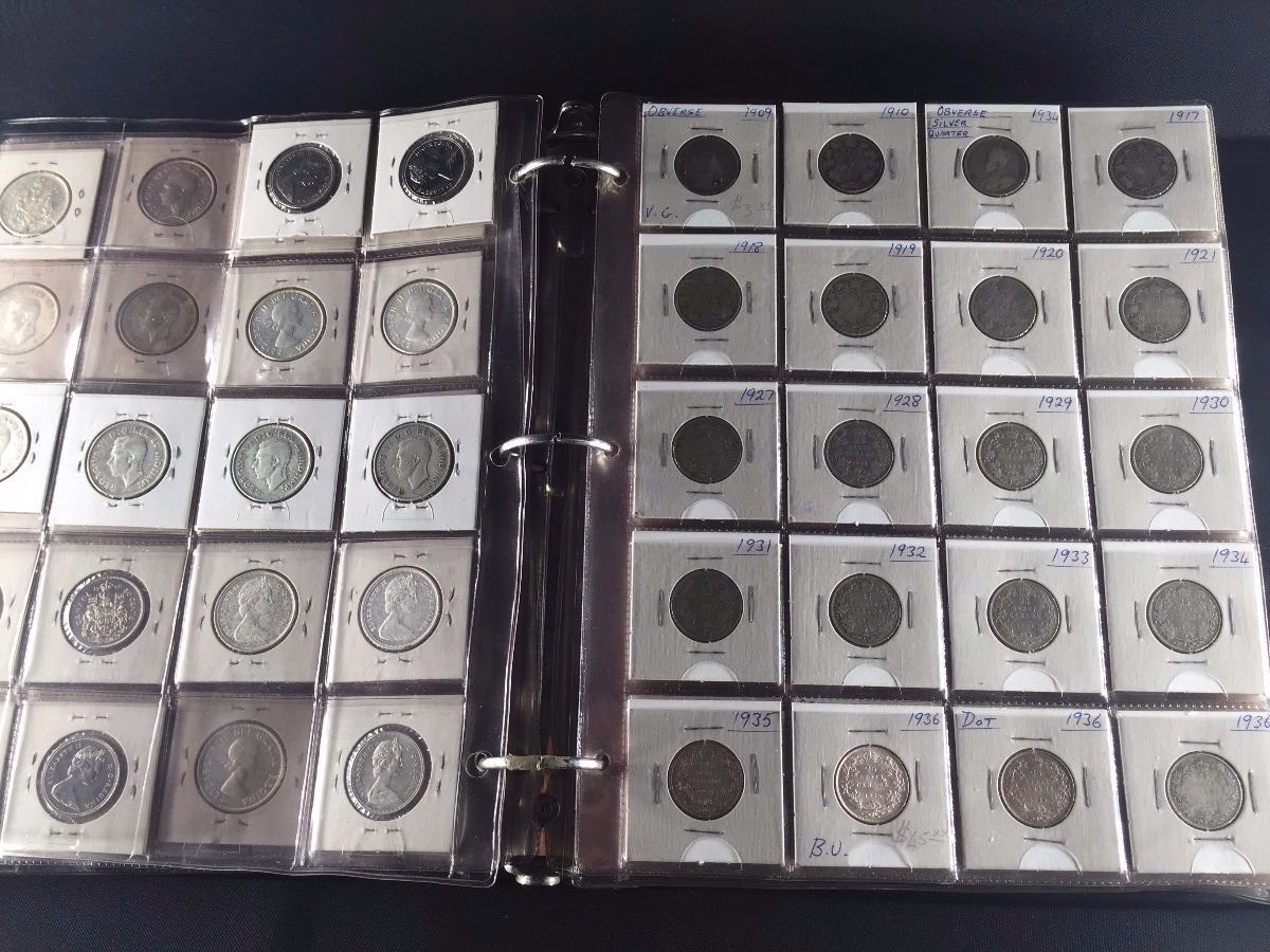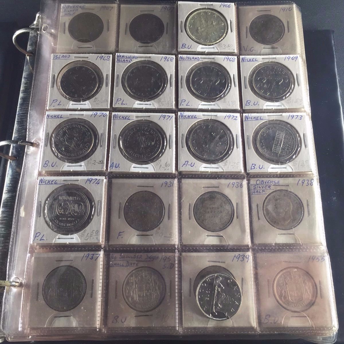 BINDER OF CANADIAN COINS, INCL. SILVER DOLLARS, HALF DOLLARS, QUARTERS AND MORE. A CHOICE DEALERS LOT!