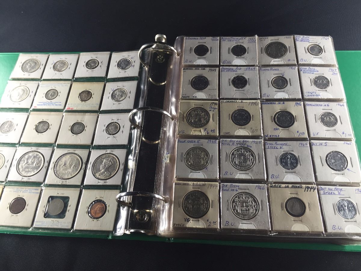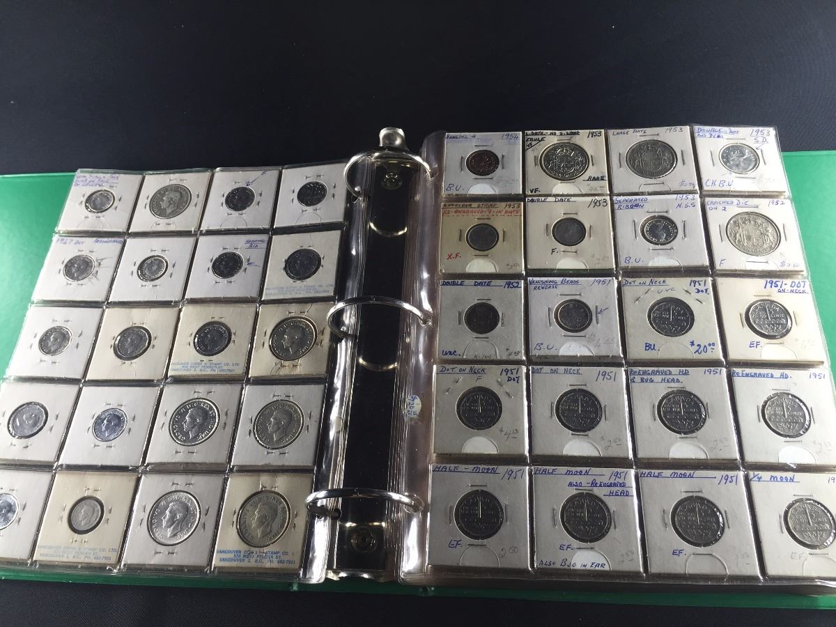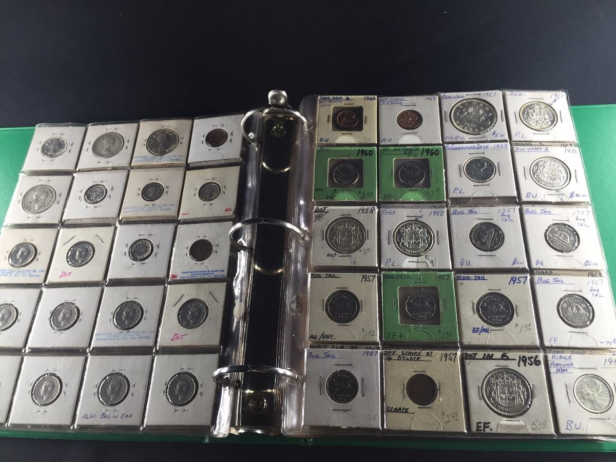 BINDER OF CANADIAN COINS, INCL. SILVER DOLLARS, HALF DOLLARS, QUARTERS AND MORE. A CHOICE DEALERS LOT!