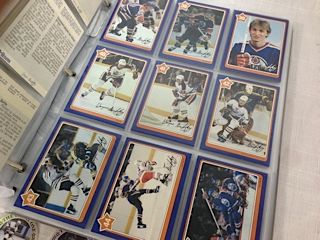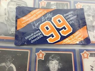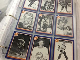 BINDER WITH APPROX 150 WAYNE GRETZKY CARDS, WAYNE GRETZKY CHOCOLATE COATED COOKIE & 36 WAYNE GRETZKY POGS