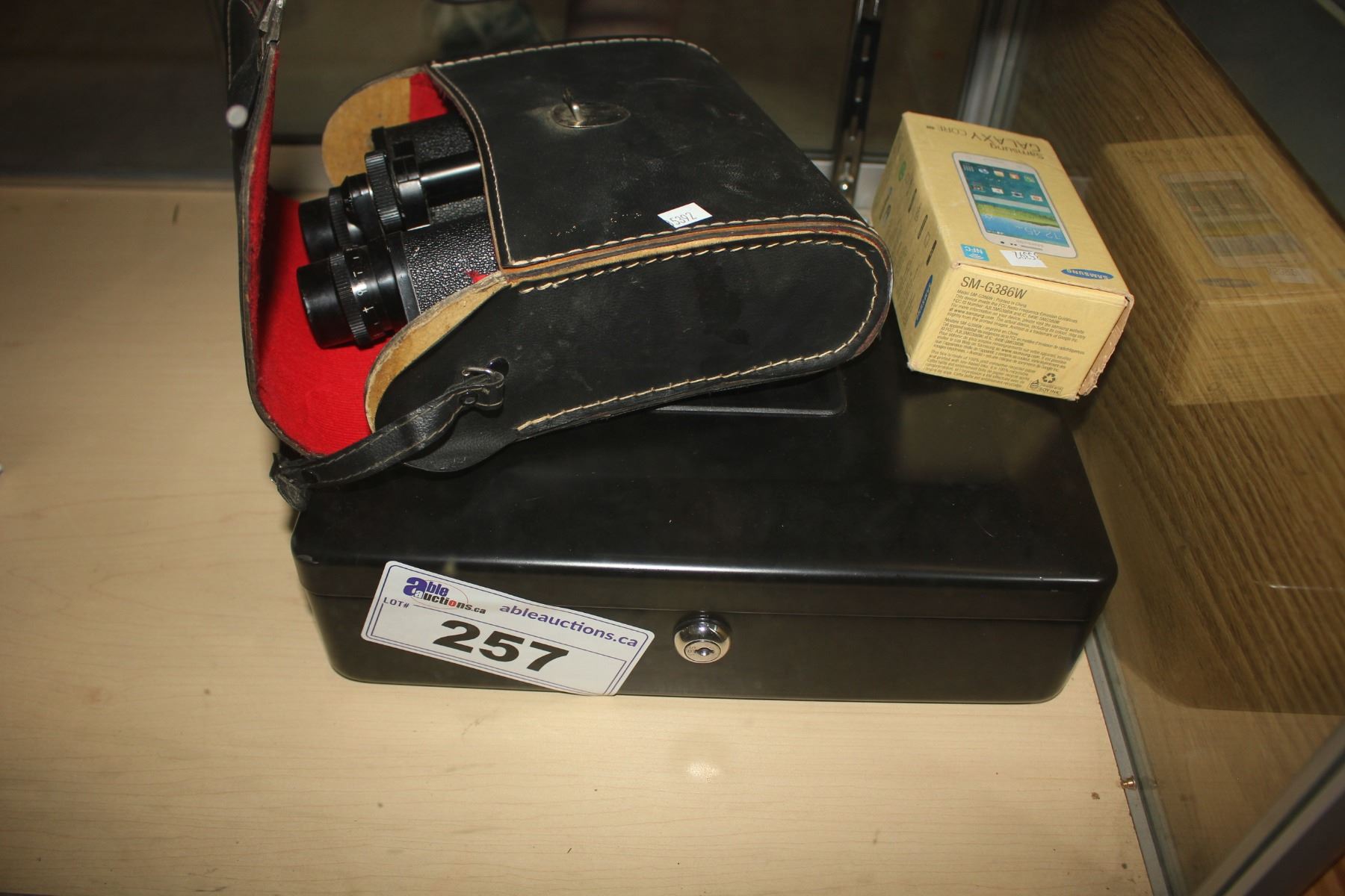 BINOCULARS, SAMSUNG GALAXY CORE SMARTPHONE, AND LOCK BOX WITH KEYS