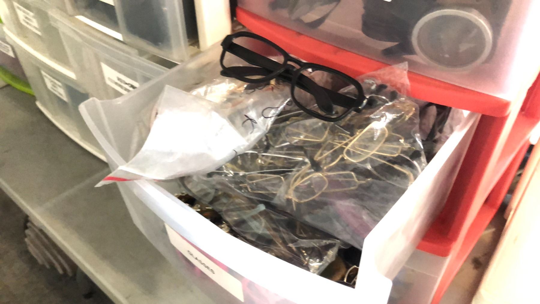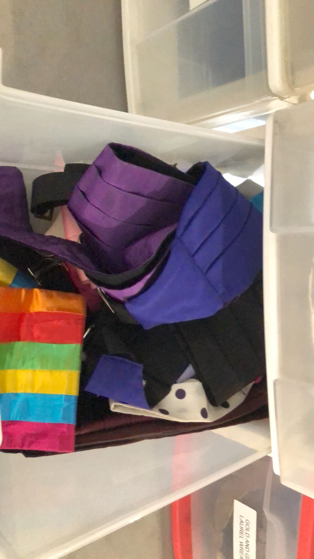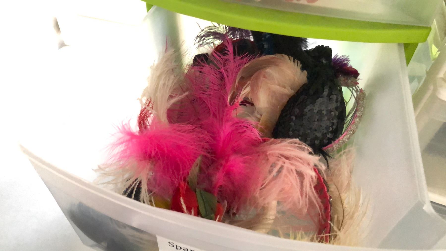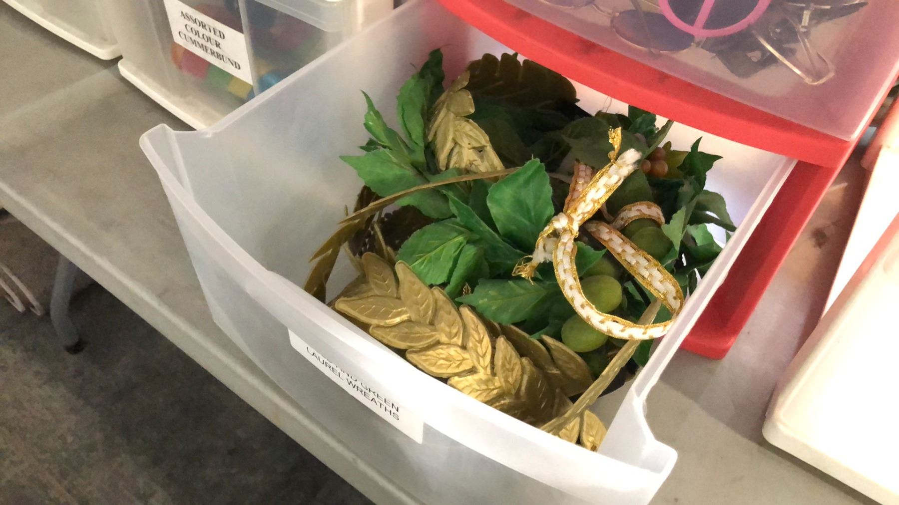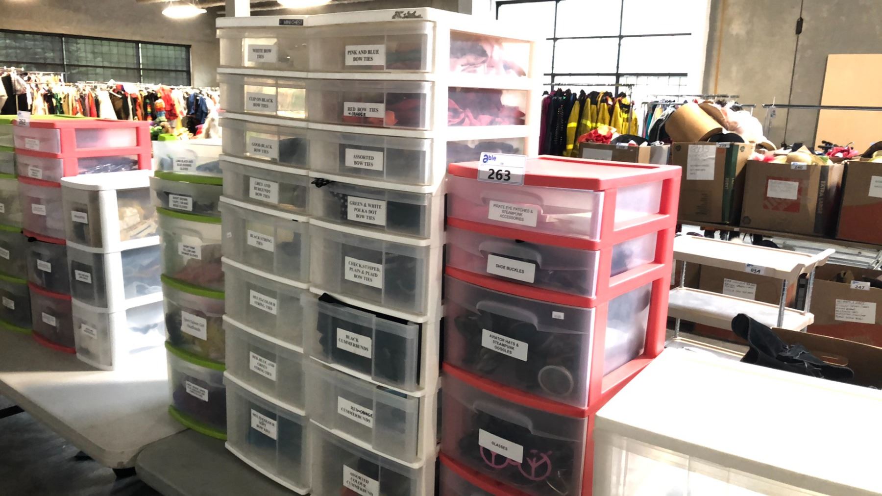 BINS OF ACCESSORIES INCLUDING BOW TIES, STEAMPUNK GOOGLES AND ACCESSORIES, GLOVES, LAUREL WREATHS CROWNS, SALOON GIRL HAIR BANDS AND MORE