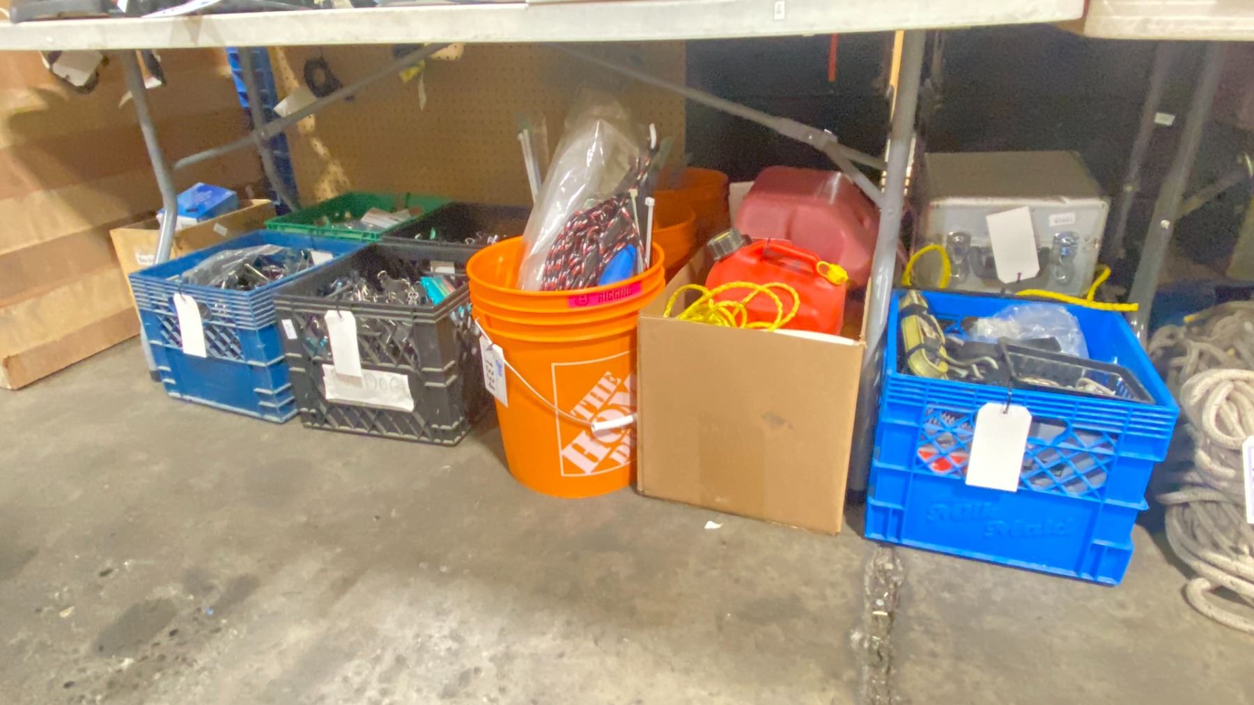 BINS OF ASSORTED BINDER CLIPS, JERRY CANS, HARDWARE, TOOLS, ROPE & VARIOUS RIGGING TOOLS / ITEMS