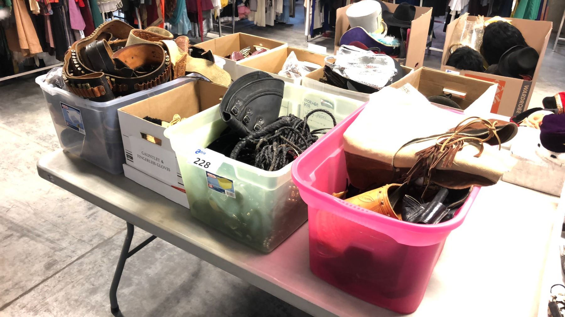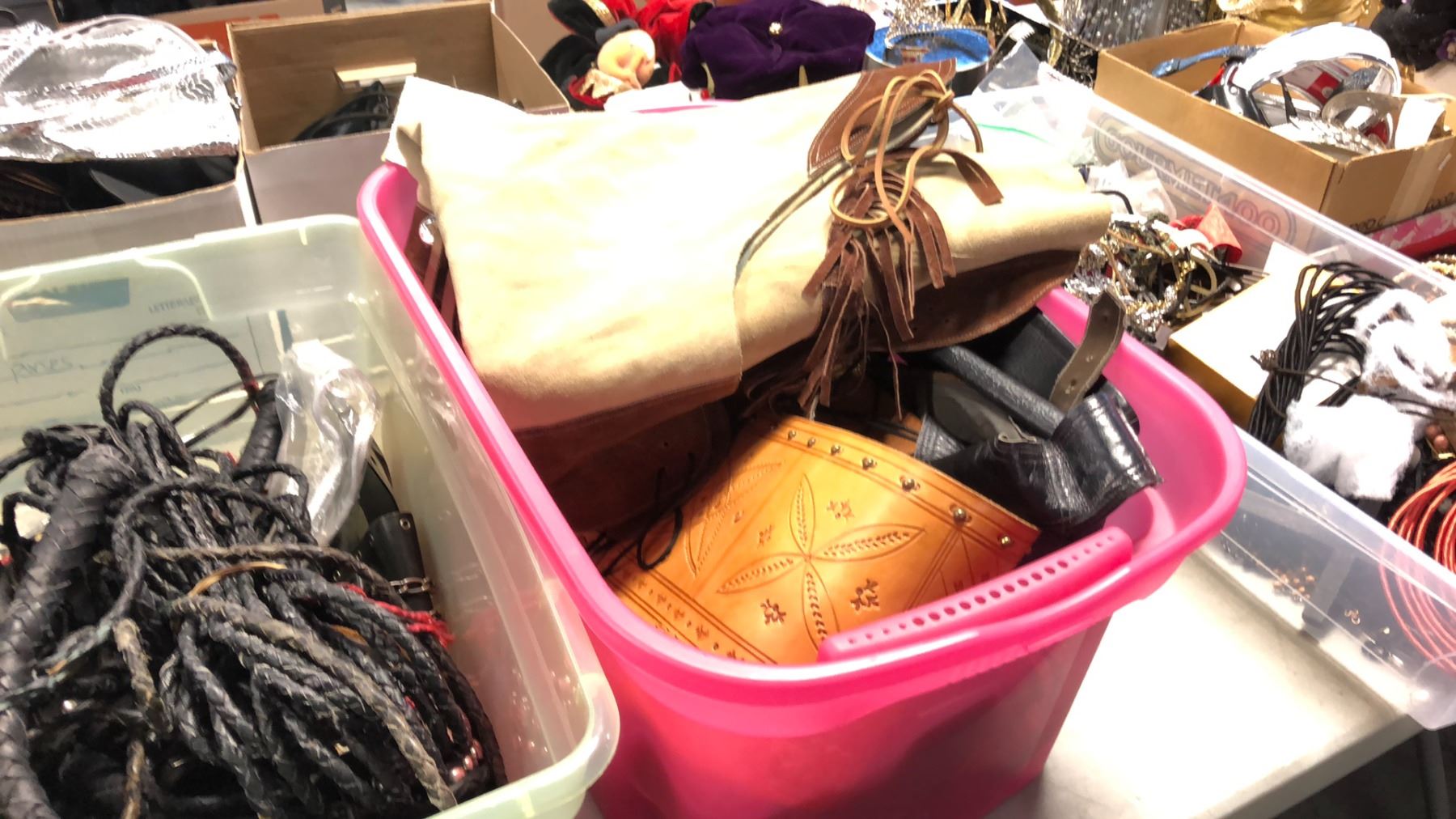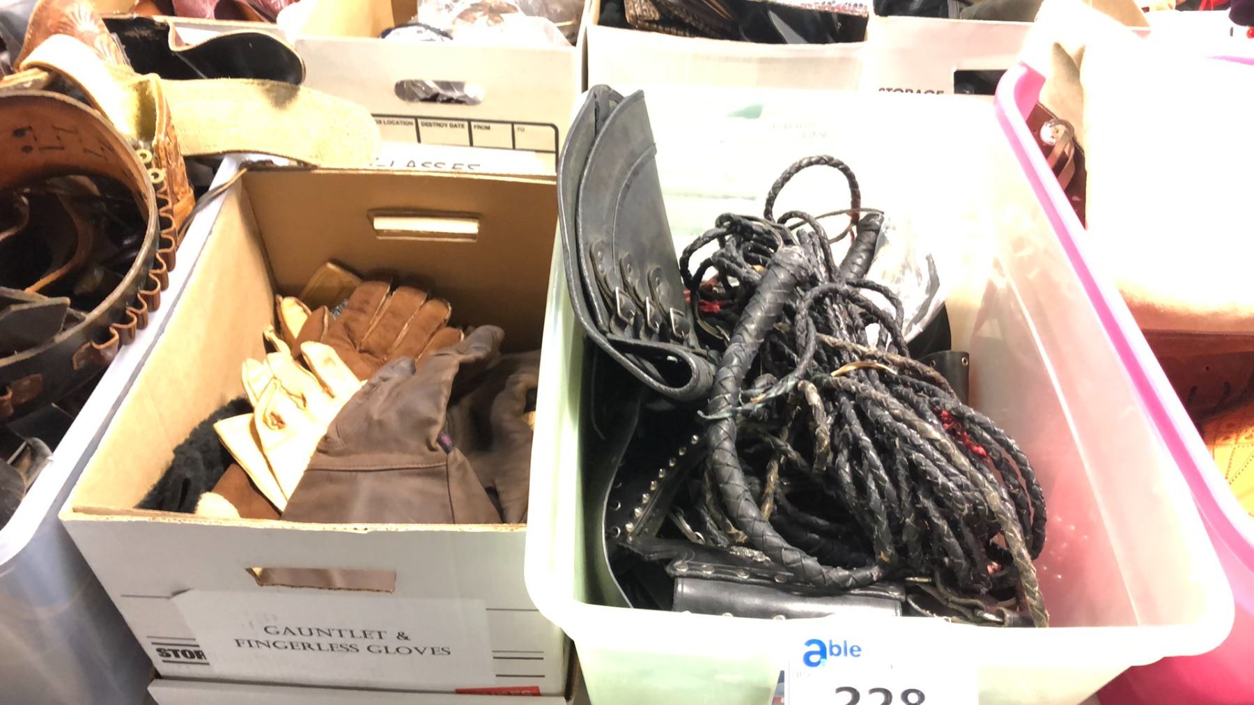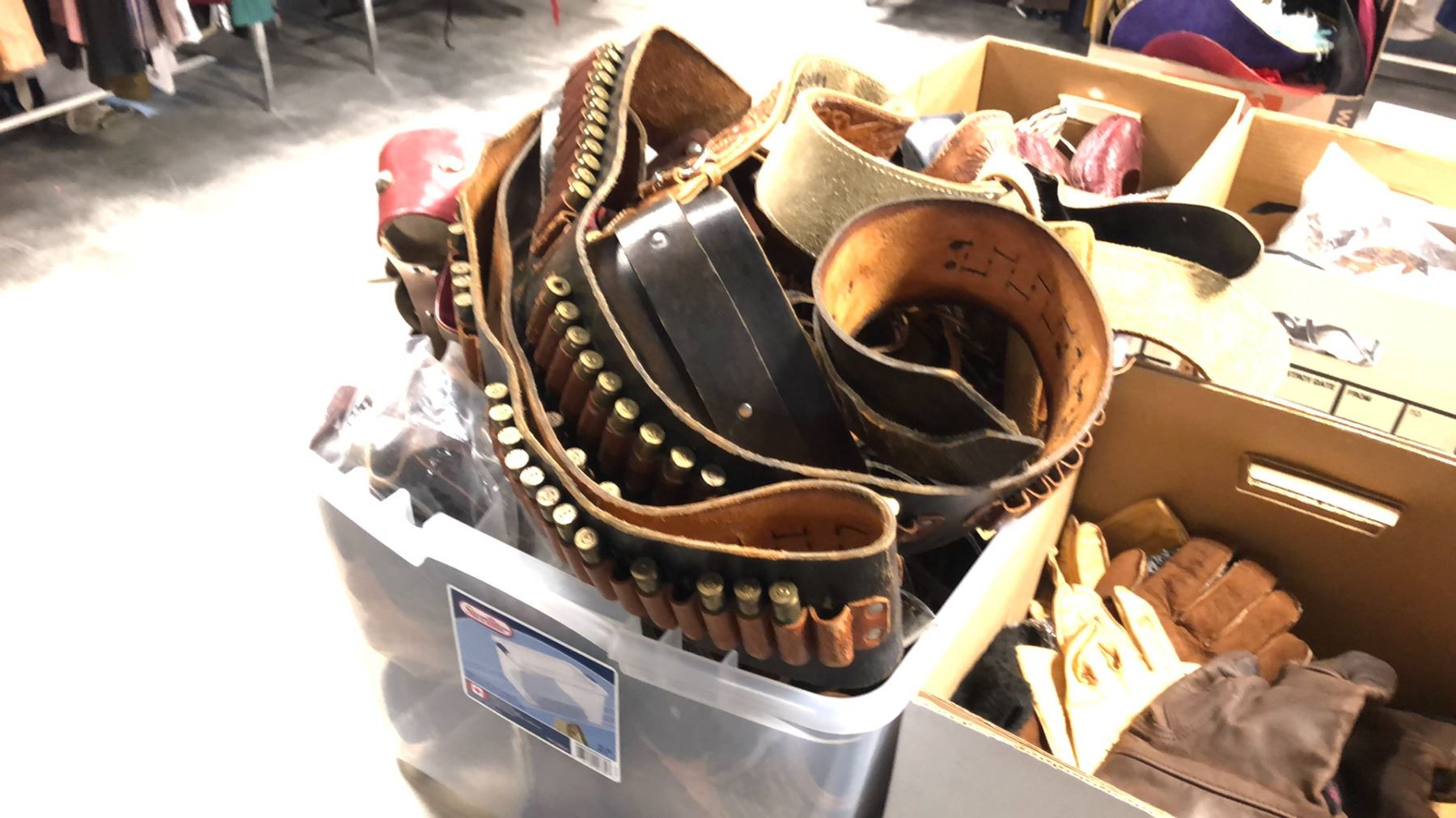 BINS OF WESTERN GEAR, HOLSTERS, BELTS, WHIPS, CHAPS, LEATHER RIDING GLOVES ETC