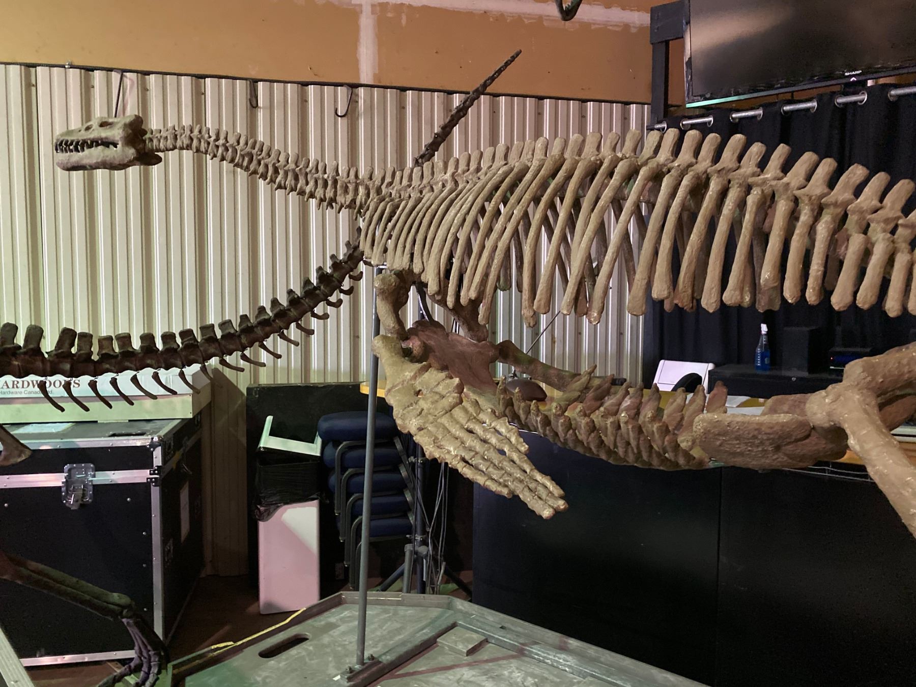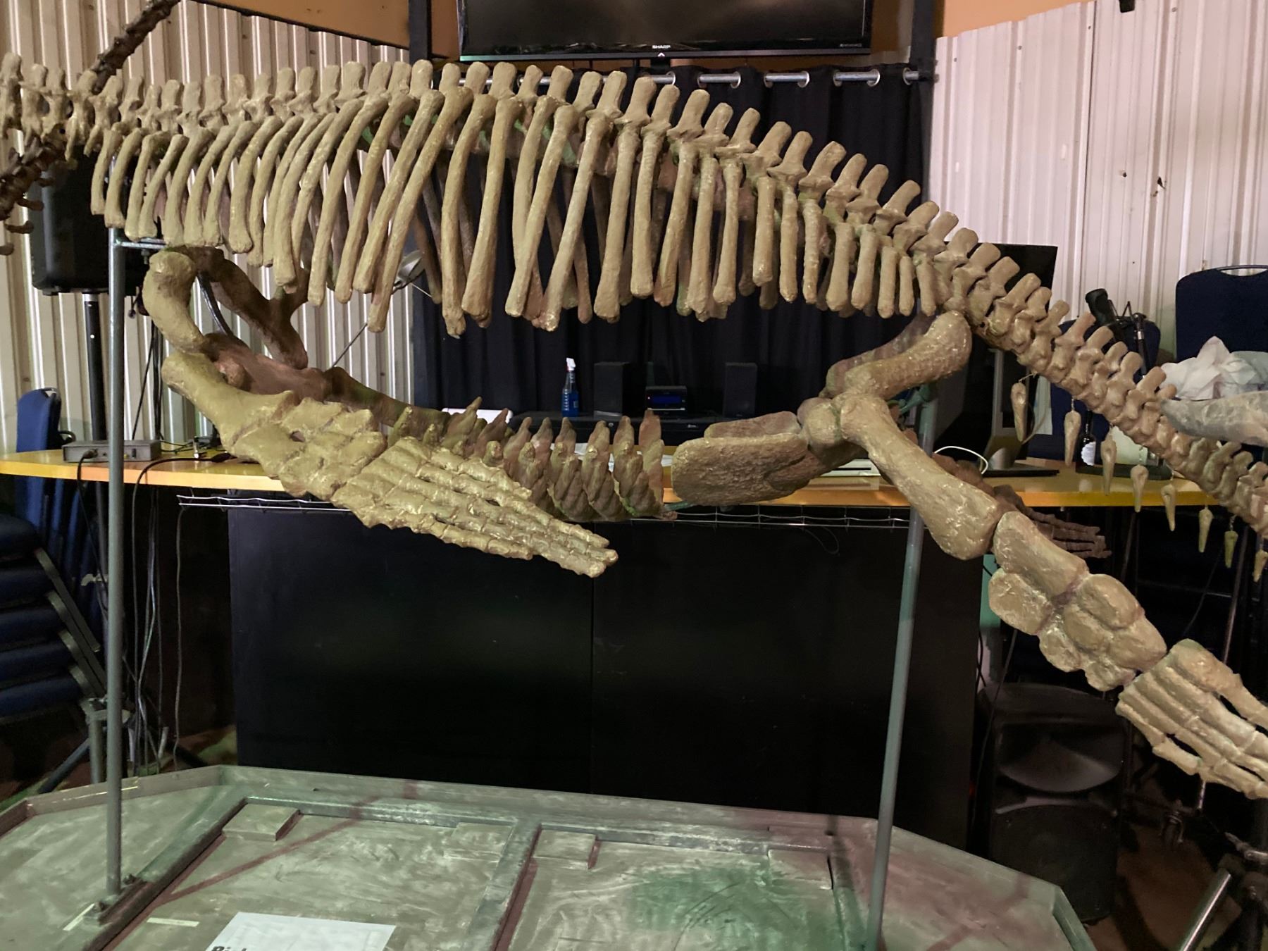 BISHANPLIOSAURUS FULL SKELETON ON STEEL FRAME, PLESIOSAUR FOUND IN CHINA FROM THE JURASSIC PERIOD, TOTAL MEASUREMENTS 42"W X 126"L X 86'H TO HEAD C/W 1-TRANSPORT CASE 42"W X 81"L X 25"H & CUSTOM INSERTS *REPRODUCTION* APPROX 800LBS
