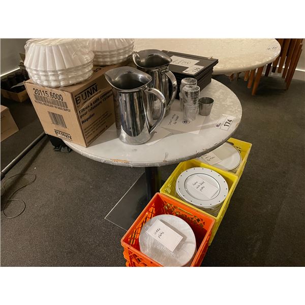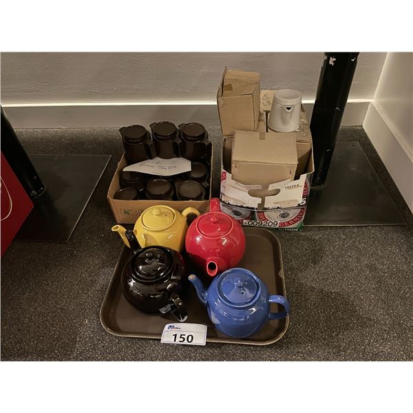 4 LARGE ASSORTED STYLE TEAPOTS, BOX OF BROWN TEAPOTS & BOX OF WHITE COMMERCIAL TEAPOTS