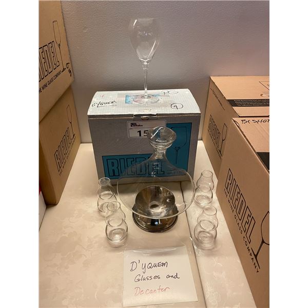 4 RIEDEL D'YQUEM STEM GLASSES, 4 MINI SCOTCH GLASSES & DECANTER
