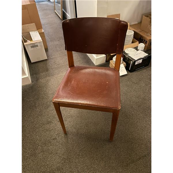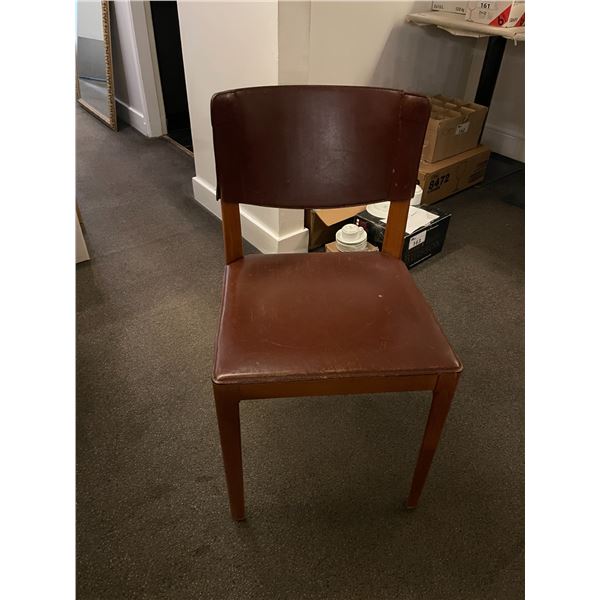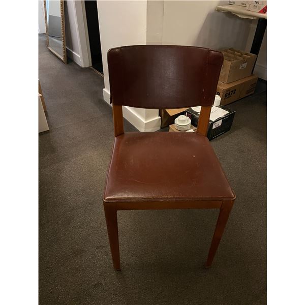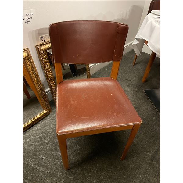 9 ANTIQUE WOOD FRAMED LEATHER STACKABLE DINING CHAIRS
