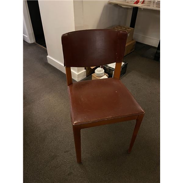 6 ANTIQUE WOOD FRAMED LEATHER STACKABLE DINING CHAIRS