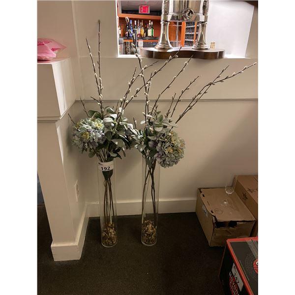 2 DECORATIVE GLASS VASES WITH FAUX FLOWERS, PUSSY WILLOWS AND HYDRANGEAS