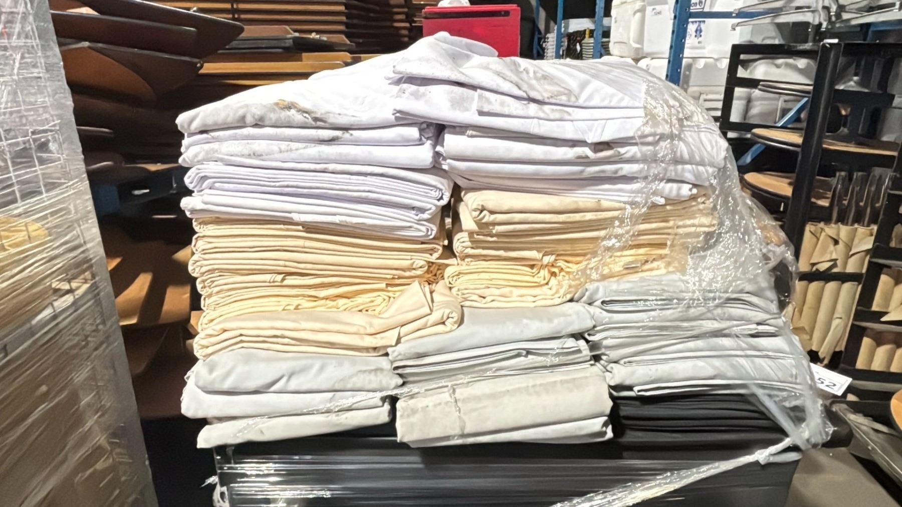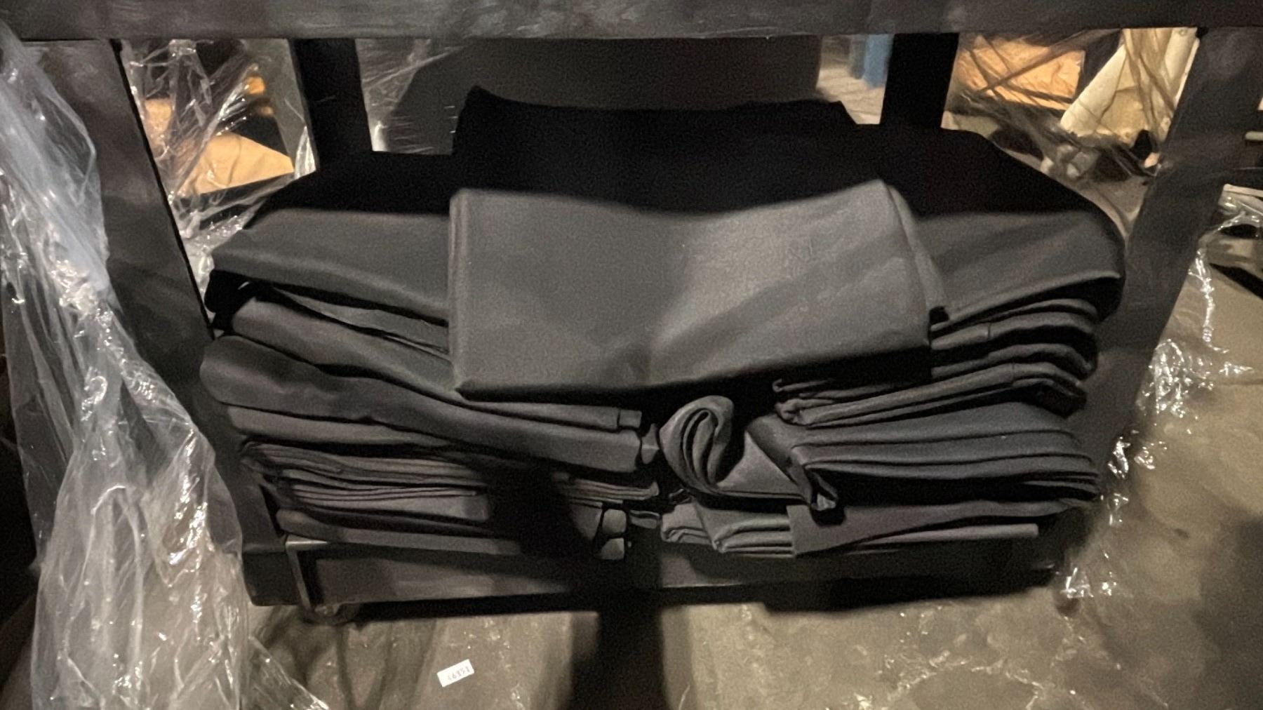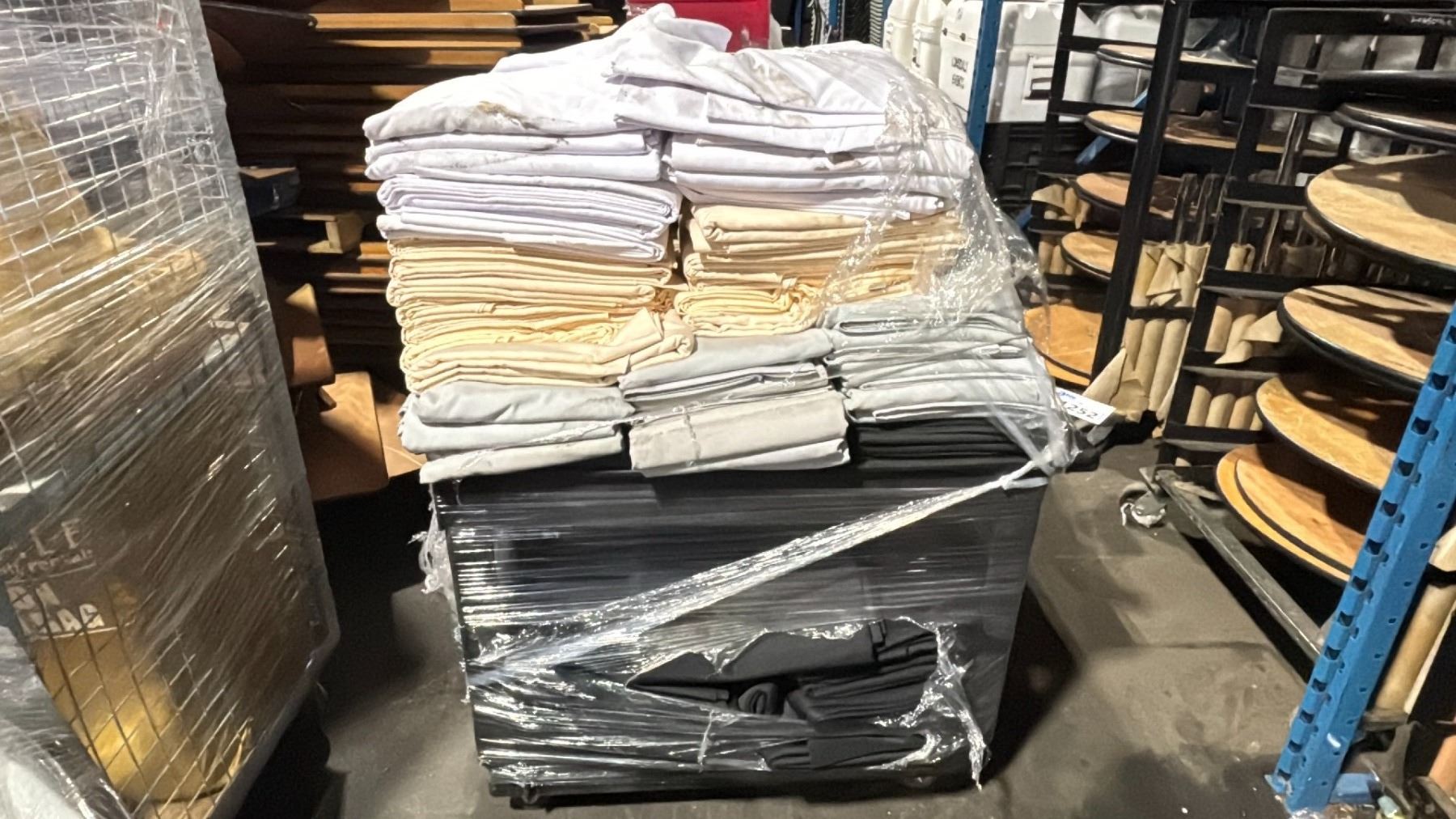 BLACK 2 TIER PRODUCT CART WITH ASSORTED SIZE/LENGTH BANQUET LINENS *SOME USED, CART INCLUDED*
