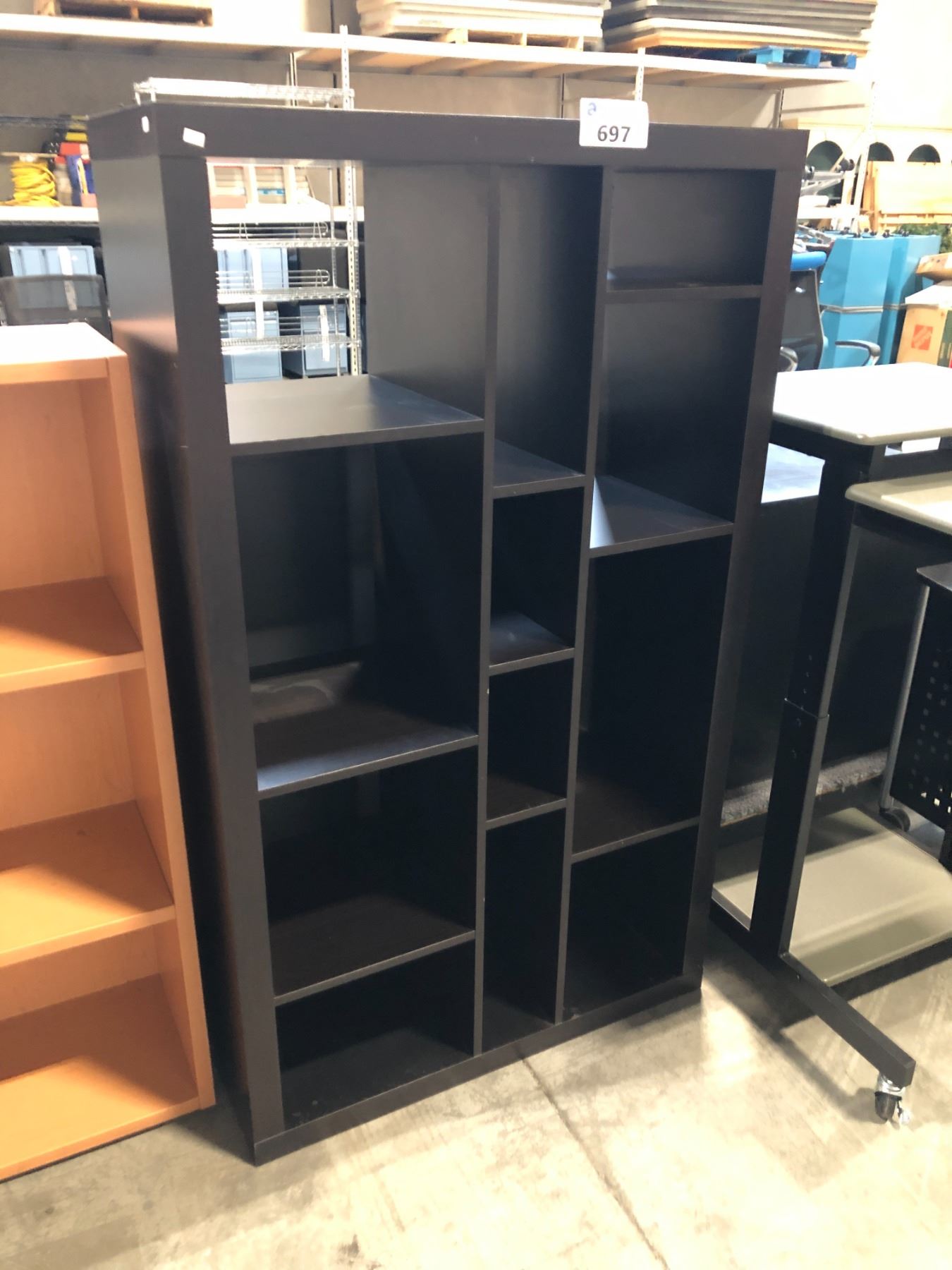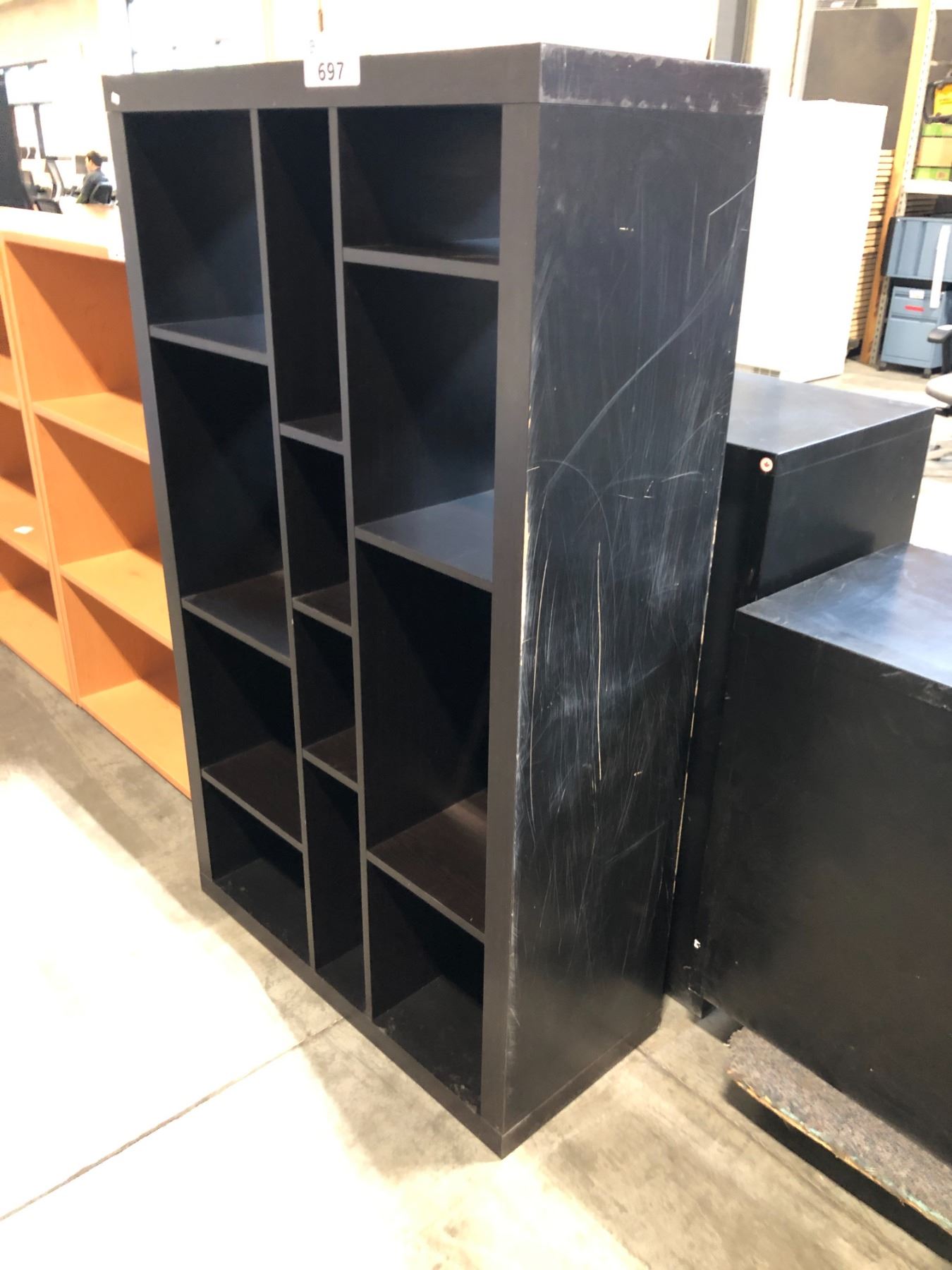 BLACK 59"H MULTI-COMPARTMENT BOOKCASE WITH CONDITION ISSUES