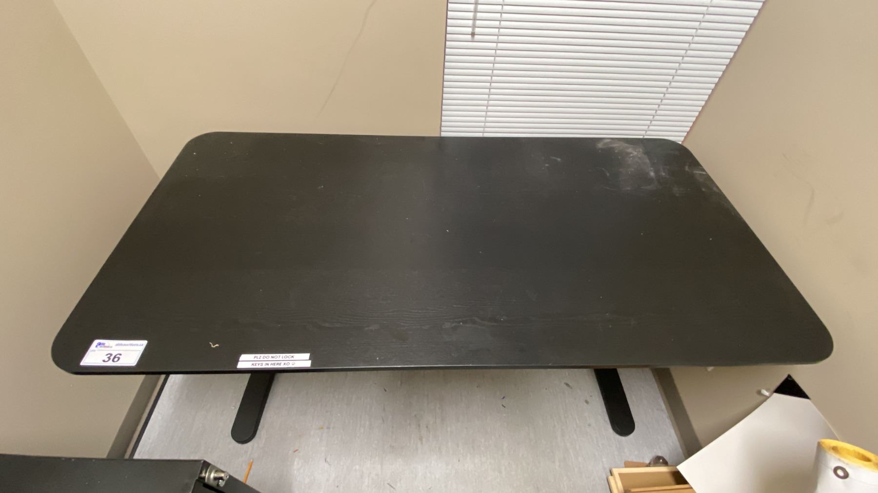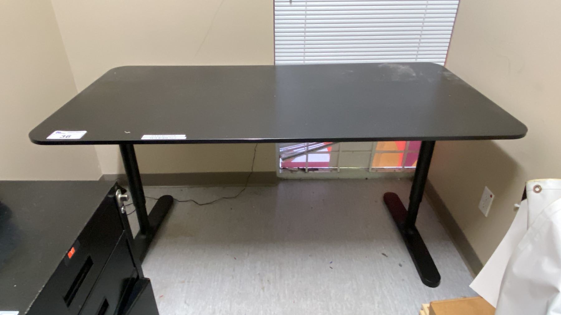 BLACK ADJUSTABLE HEIGHT OFFICE DESK - APPROX. 63" ACROSS X 31 1/2" WIDE
