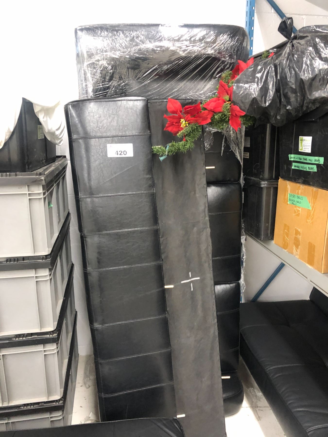 BLACK AND BROWN WOOD ACCENT 3 SEAT SOFA, DISASSEMBLED, CONDITION UNKNOWN
