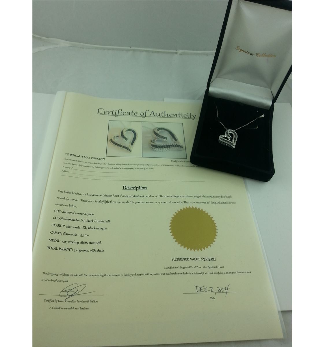 BLACK AND WHITE DIAMOND HEART NECKLACE SET, 53 DIAMONDS IN TOTAL. STERLING SILVER. INCLUDES $725 CERTIFICATE