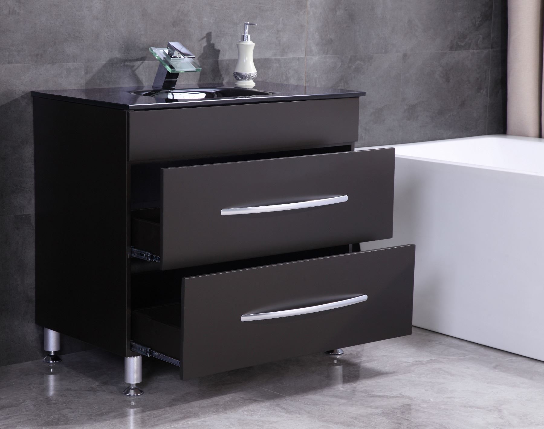 BLACK BATHROOM VANITY - SOLID WOOD 2 DRAWER VANITY WITH BLACK TEMPERED GLASS COUNTER & UNDER MOUNT SINK 36"W X 20.5"D X 35.5"H