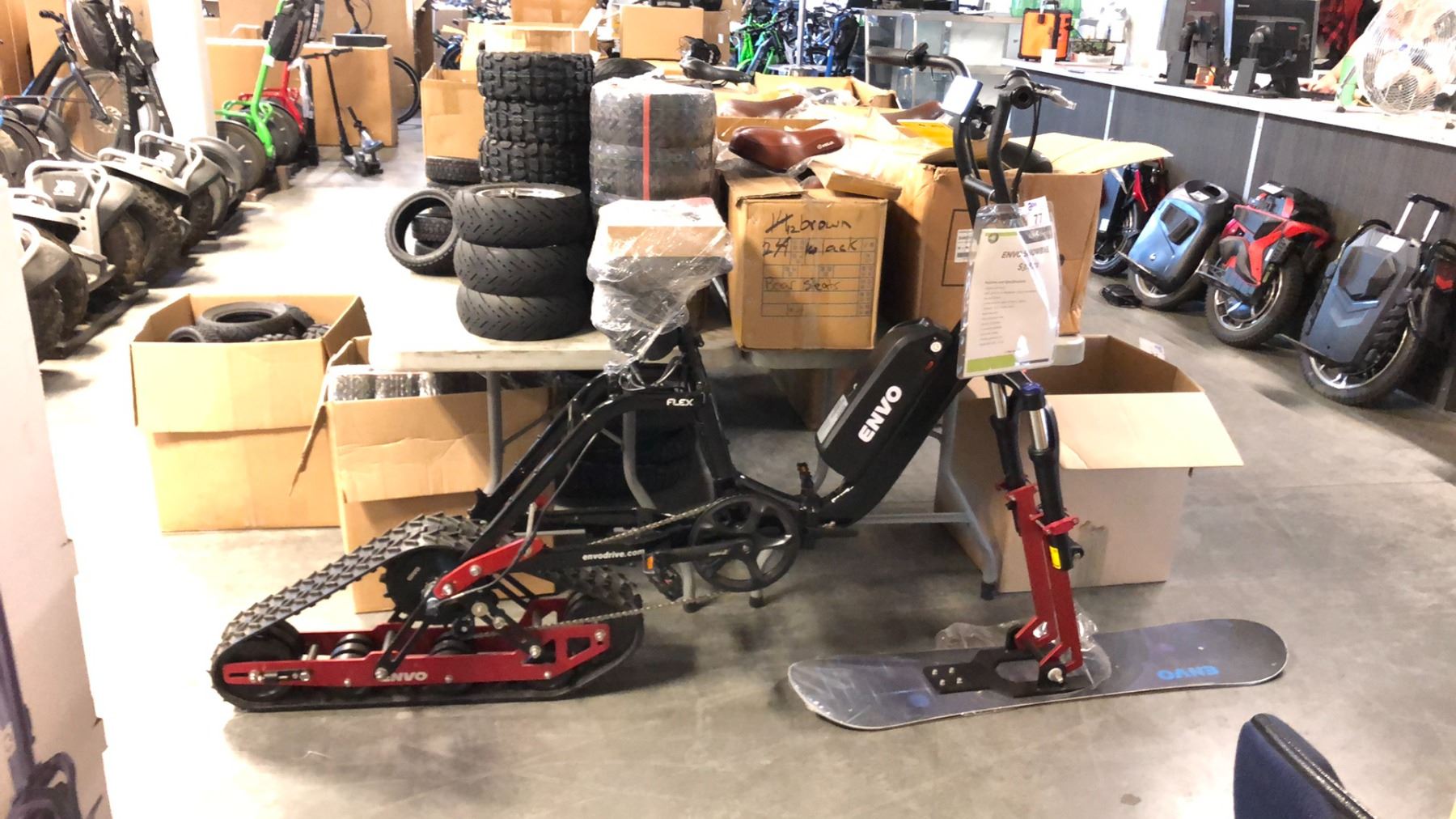 BLACK ENVO FLEX ELECTRIC SNOWBIKE BATTERY 48V, LCD DISPLAY WITH SPEEDOMETER, ODOMETER, PEDAL ASSIST INDICATOR ETC, 5 LEVEL PEDAL ASSIST, BRAKE TRIGGERED BACKLIGHT, WATER RESISTANT WIRING, ELECTRIC BRAKING AND MORE