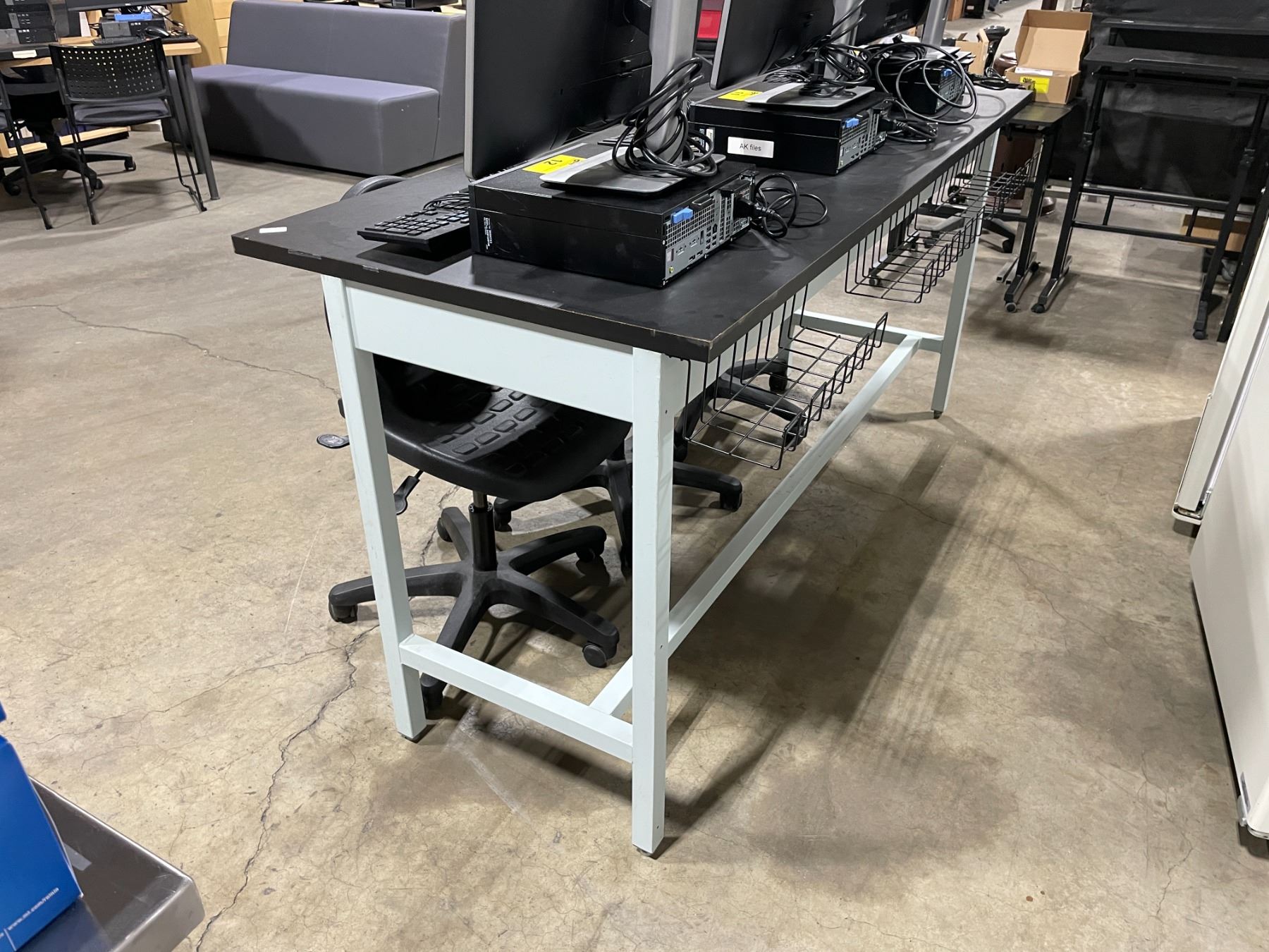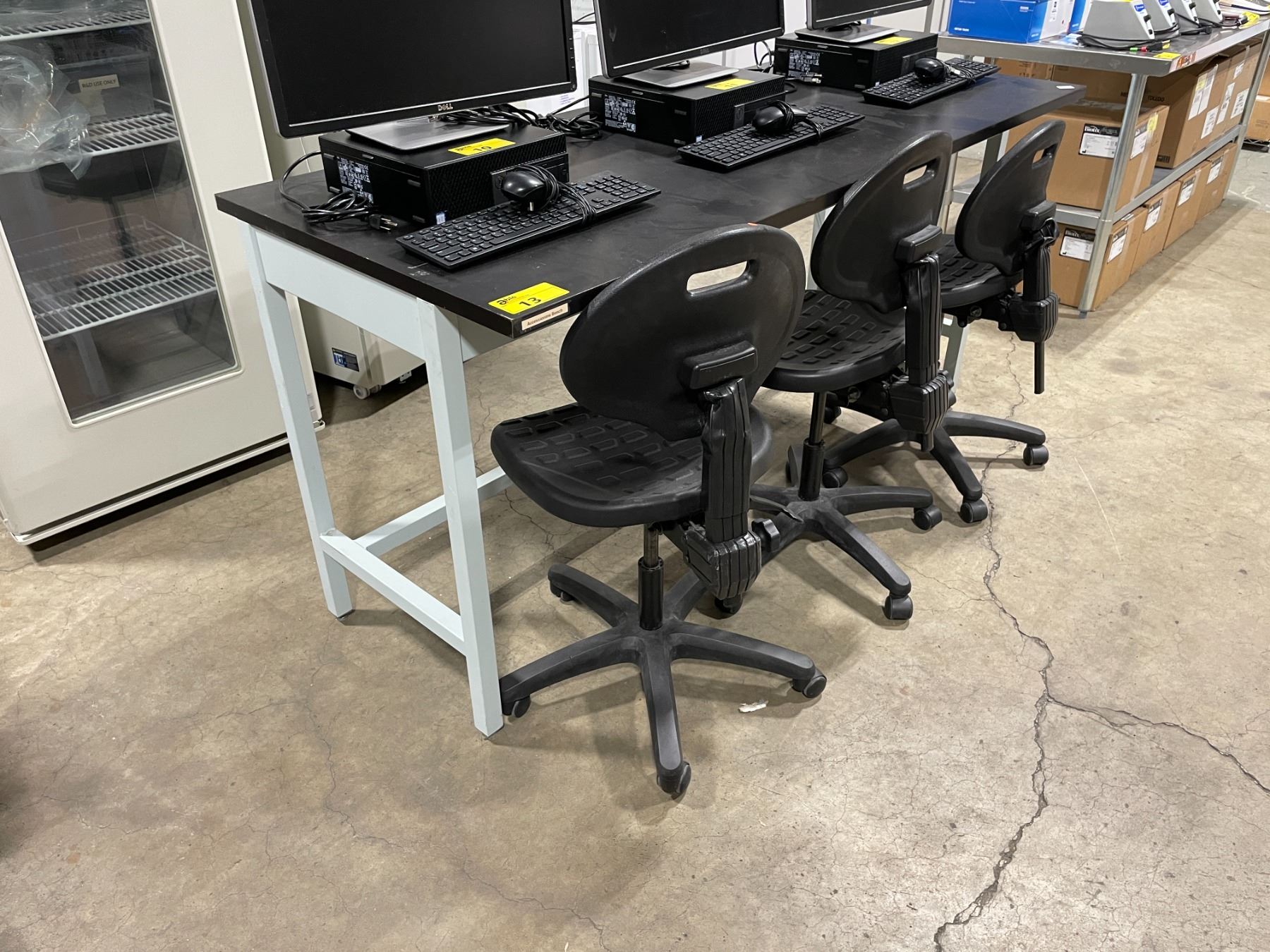 BLACK / GREY 72"W X 30"D X 36"H COMMERCIAL BIOMEDICAL LABORATORY TABLE WITH 3 MOBILE LABORATORY CHAIRS