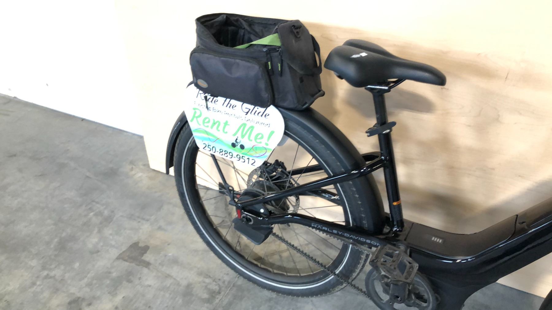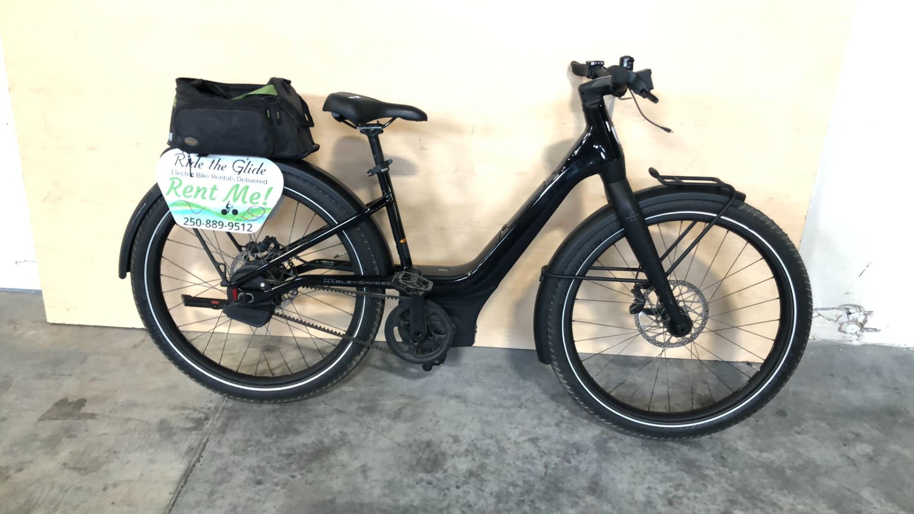 BLACK HARLEY DAVIDSON RUSH/CTY BELT DRIVEN ELECTRIC BICYCLE WITH 2 LUGGAGE RACKS, MOUNTED STORAGE BAG, HEAD LIGHT *FORMER RENTAL* *NO CHARGER*