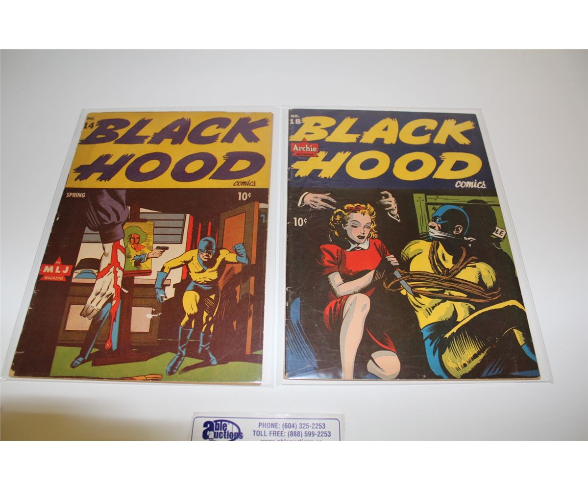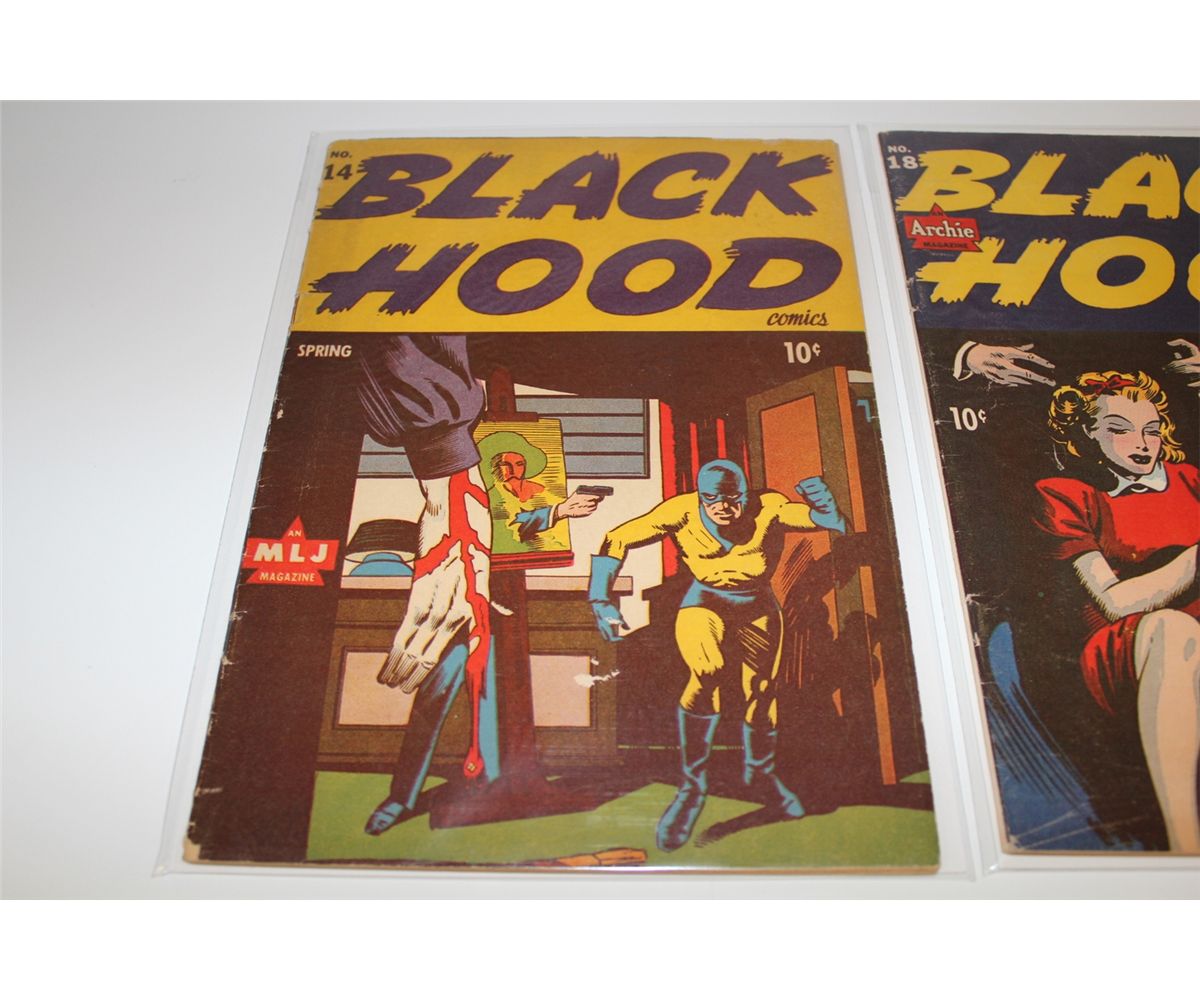 BLACK HOOD COMICS #14 & 18 (1945-46) #14 KINSTLER BLOOD COVER. 2 VERY SHARP MID GRADE COPIES. CLASSIC GOLDEN AGE, RARE IN GRADE.